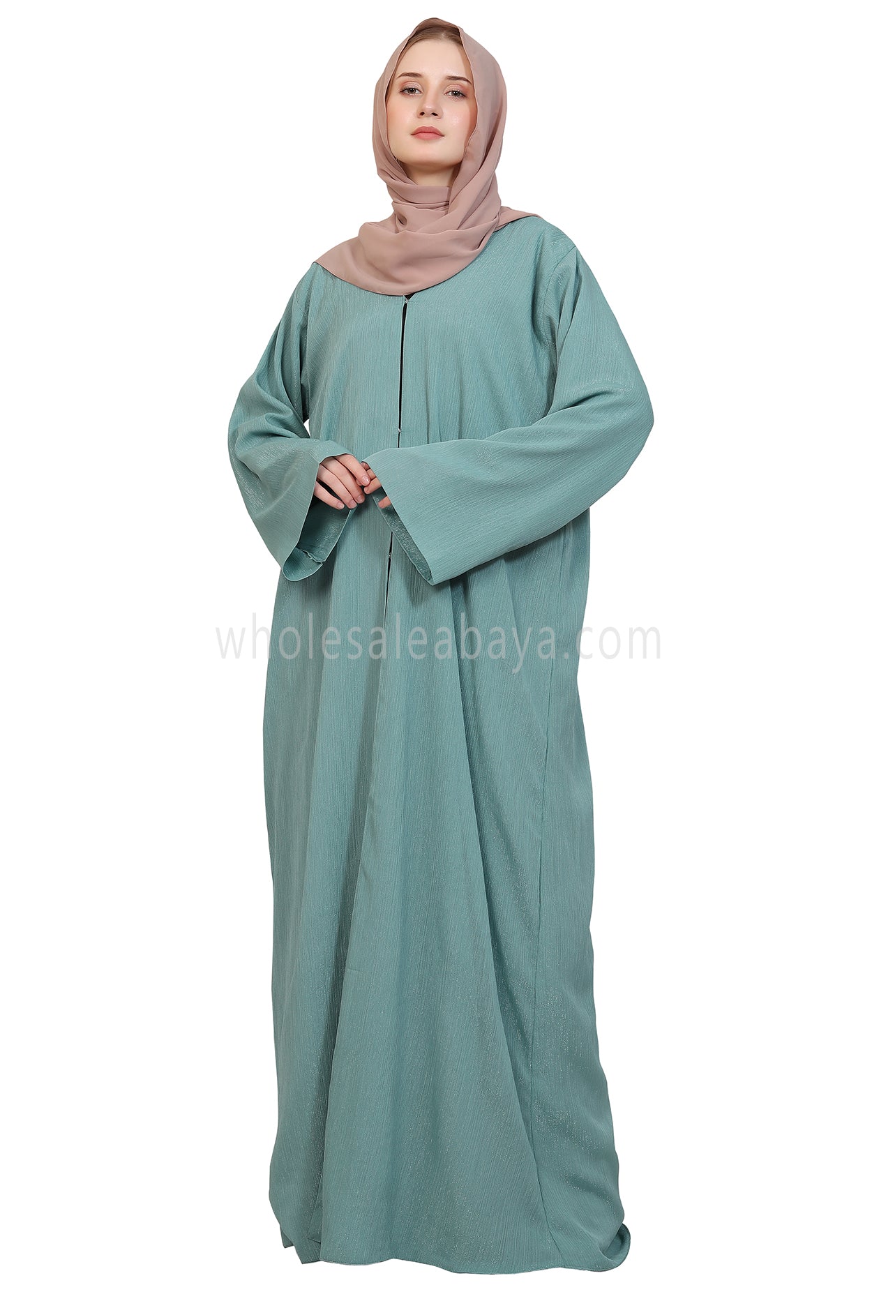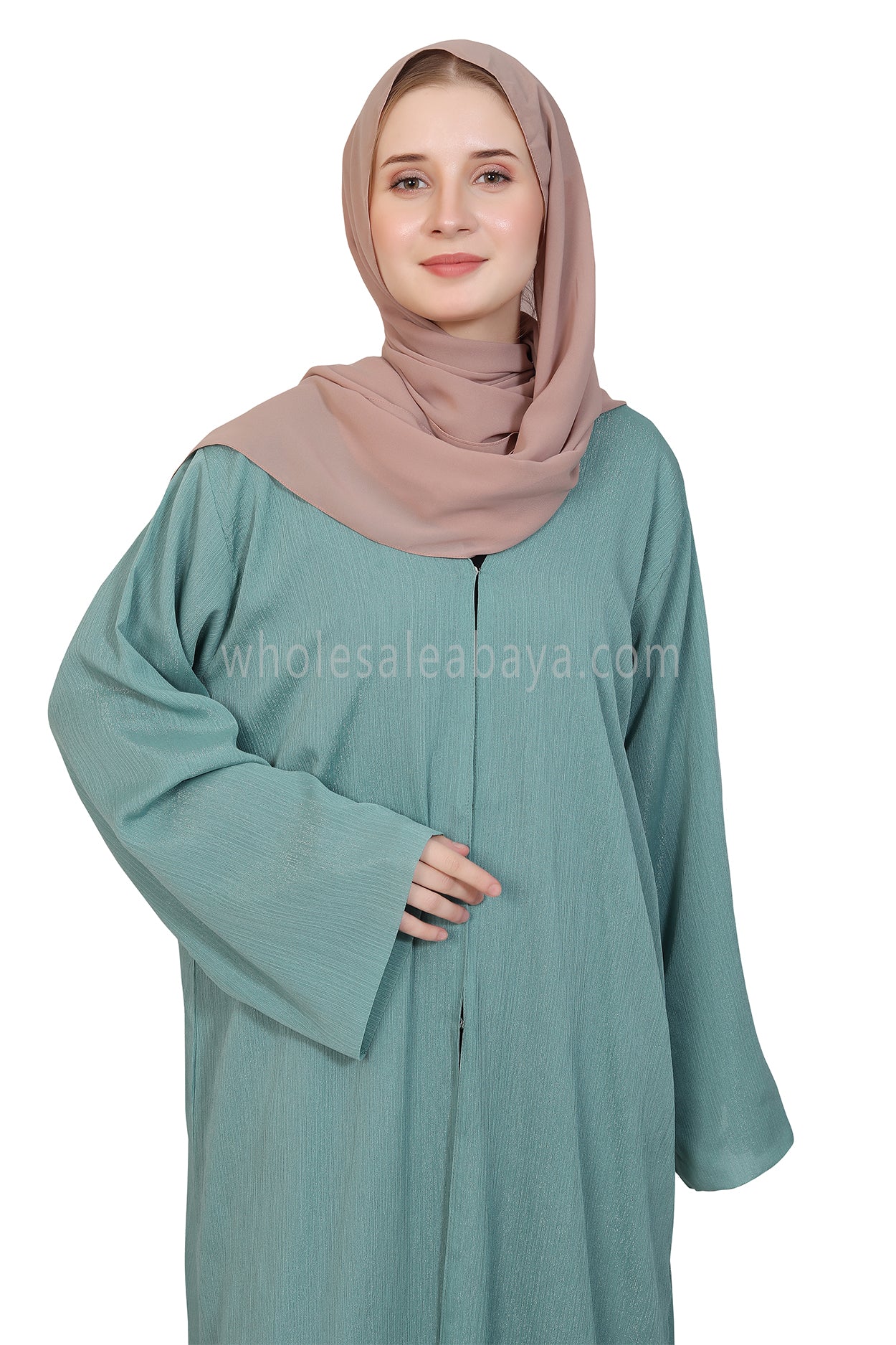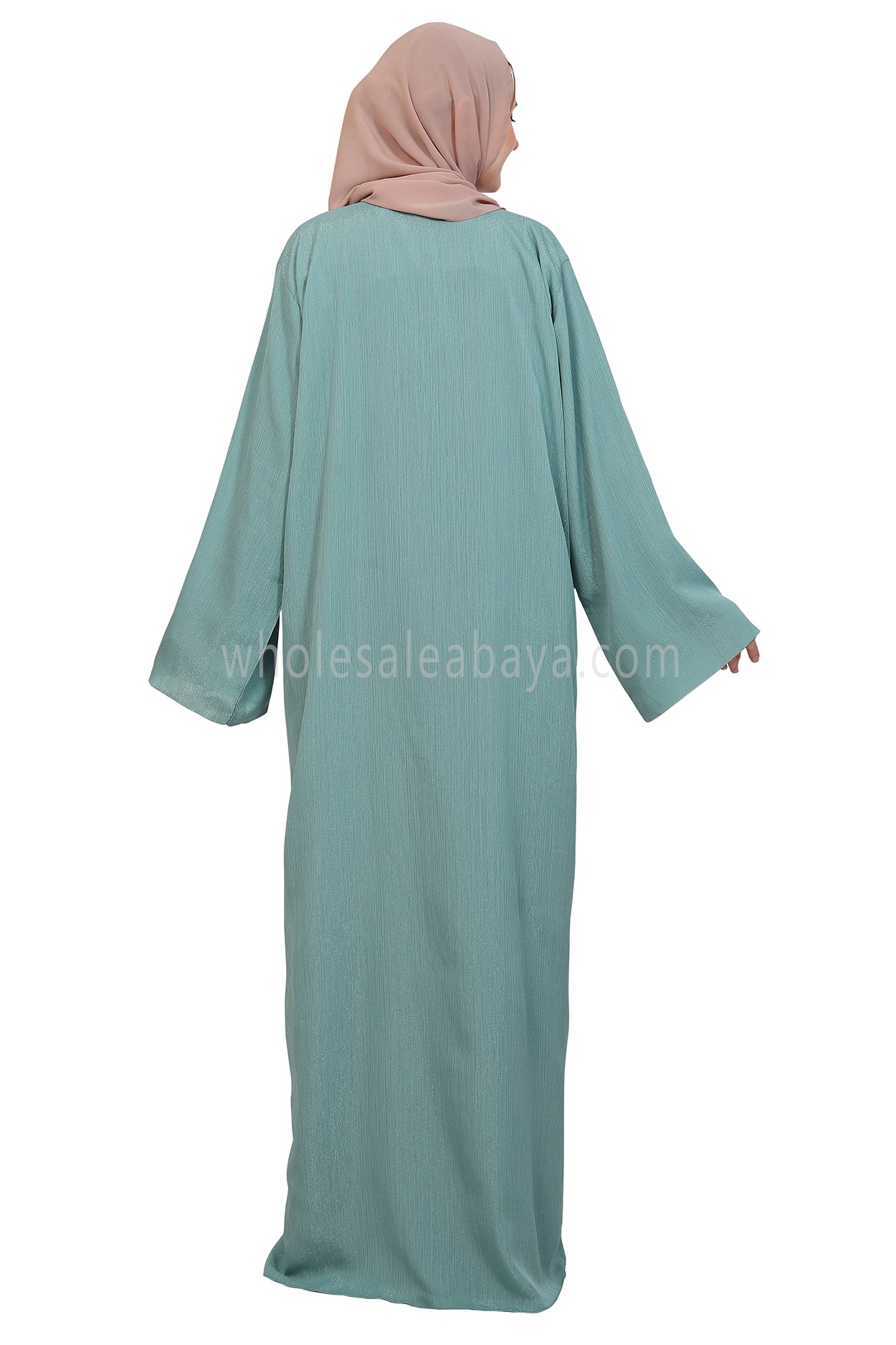This Chiffon Metallic Open Abaya features a double-layered shimmer chiffon fabric that creates a graceful overlay and enhances the flowy silhouette. Designed with a front button closure and additional sleeve buttons, it offers both elegance and practicality. The subtle glittery finish adds a sophisticated touch, making it an ideal choice for special occasions.