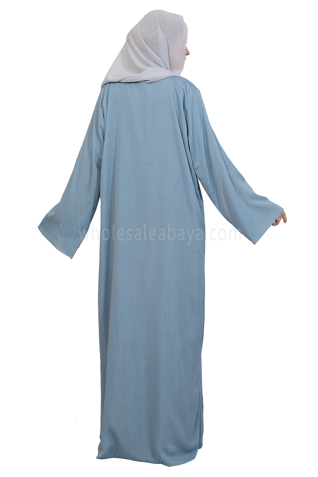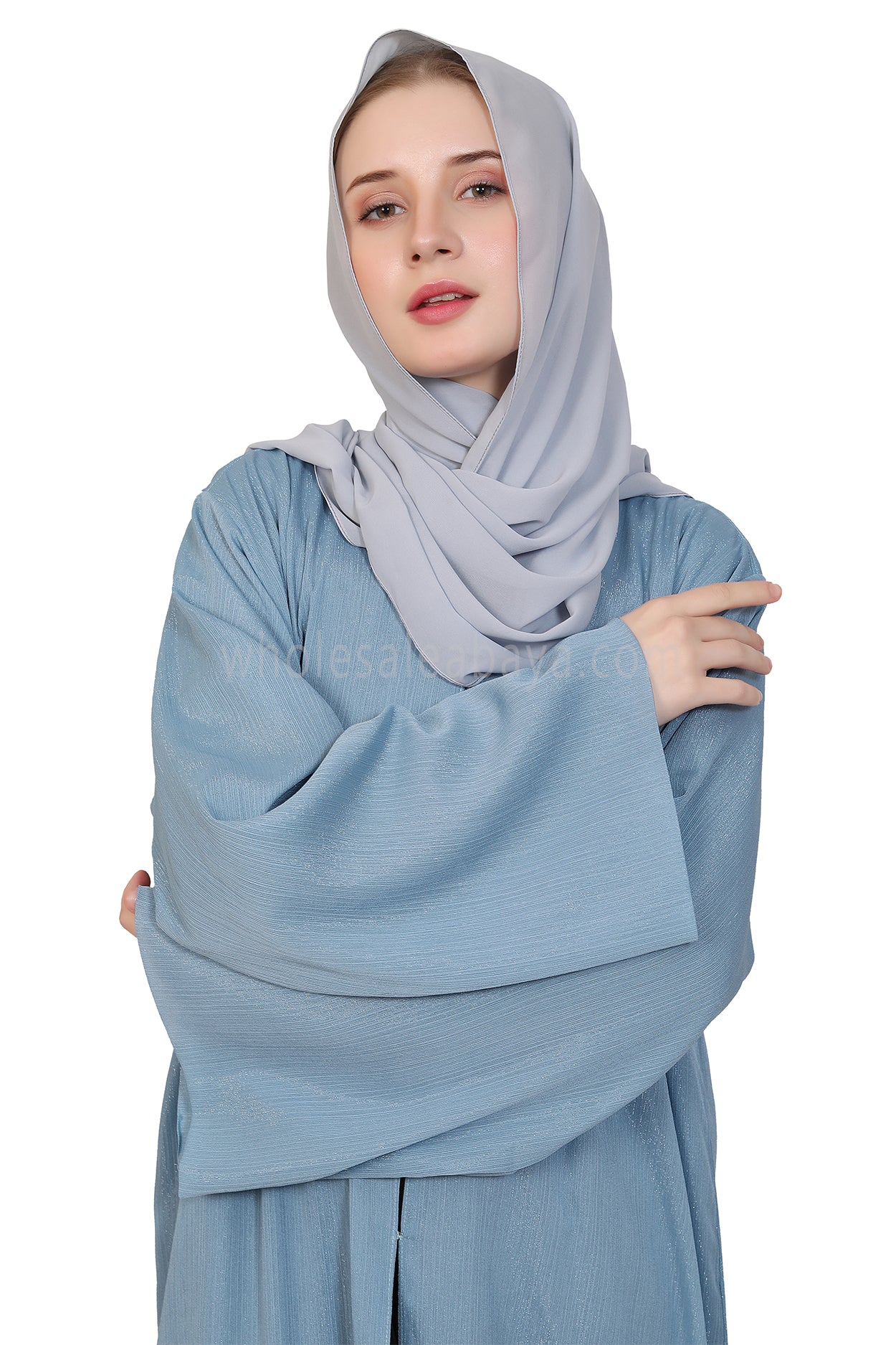 This Chiffon Metallic Open Abaya features a double-layered shimmer chiffon fabric that creates a graceful overlay and enhances the flowy silhouette. Designed with a front button closure and additional sleeve buttons, it offers both elegance and practicality. The subtle glittery finish adds a sophisticated touch, making it an ideal choice for special occasions.