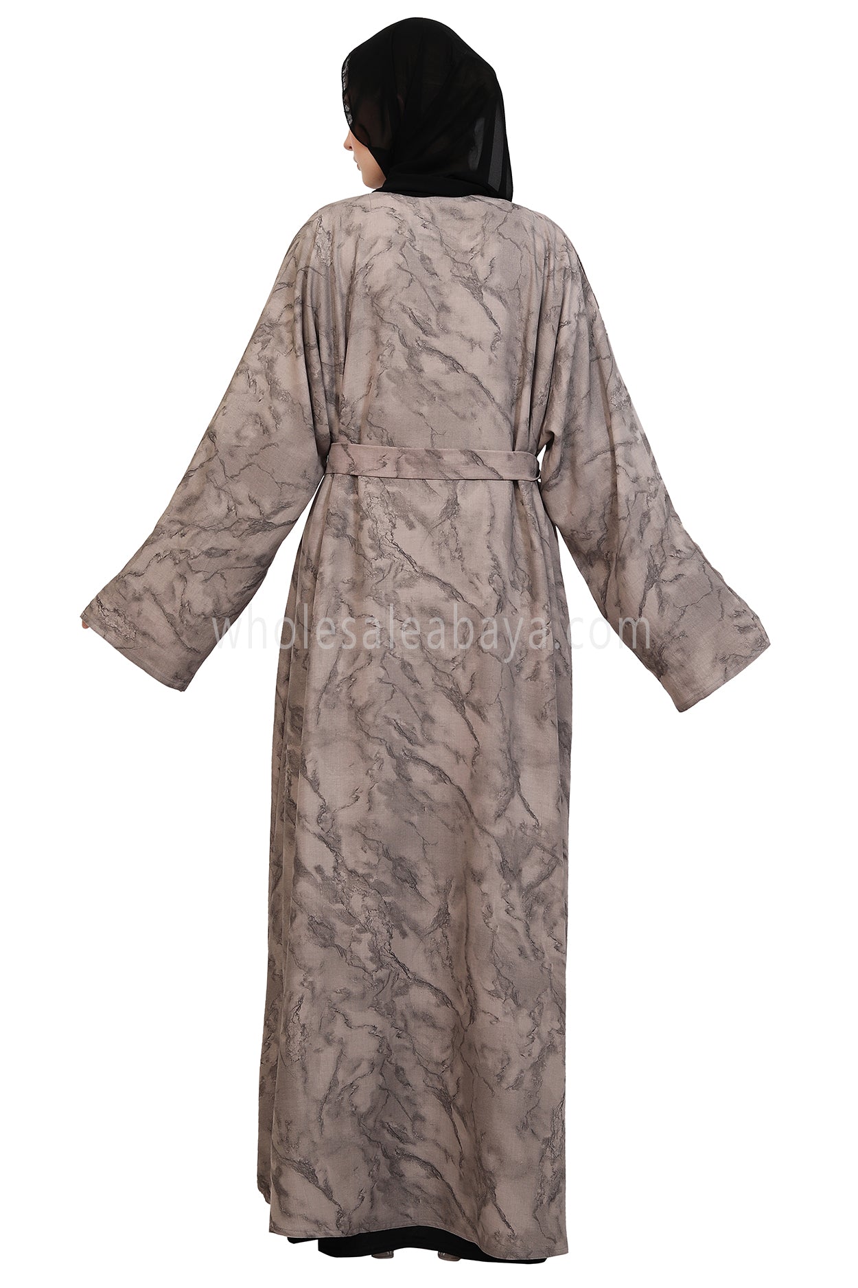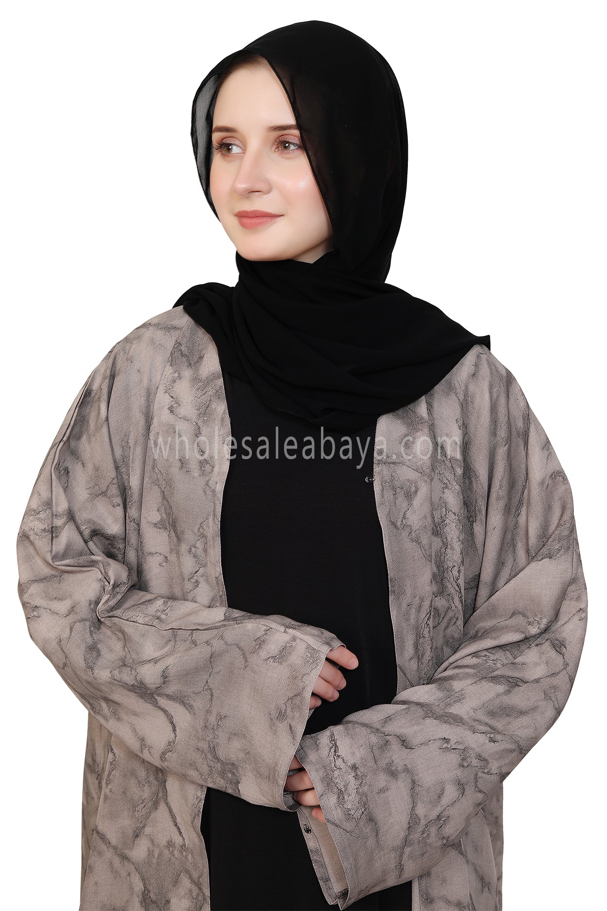 Discover effortless elegance with this Stylish Plain Open Abaya made from soft Printed Linen Jacquard fabric, featuring a subtle marble-effect design for a refined look. Its front open style with a single button and flowy silhouette offers both comfort and versatility for everyday or occasion wear. Designed with practical sleeve buttons to prevent rolling, this abaya combines minimalism with functional sophistication.