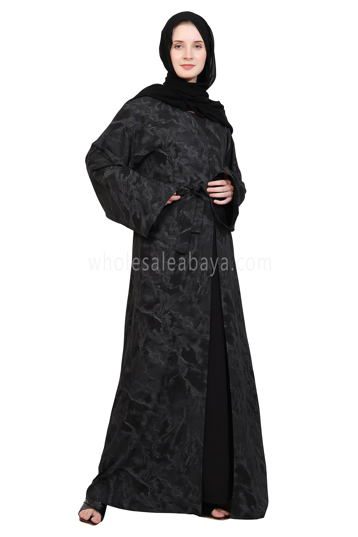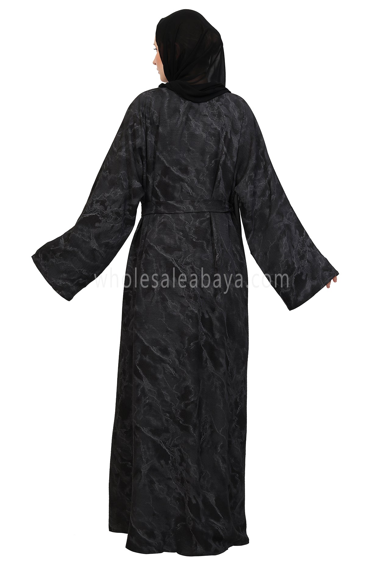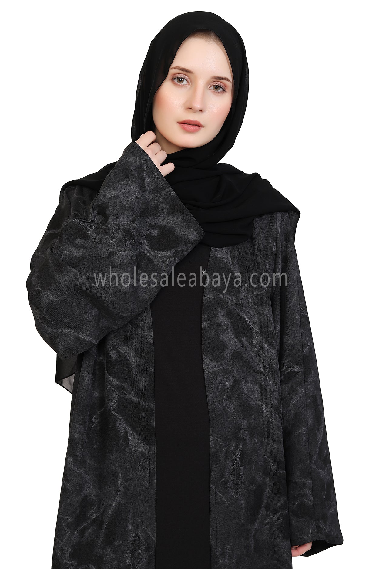 Discover effortless elegance with this Stylish Plain Open Abaya made from soft Printed Linen Jacquard fabric, featuring a subtle marble-effect design for a refined look. Its front open style with a single button and flowy silhouette offers both comfort and versatility for everyday or occasion wear. Designed with practical sleeve buttons to prevent rolling, this abaya combines minimalism with functional sophistication.