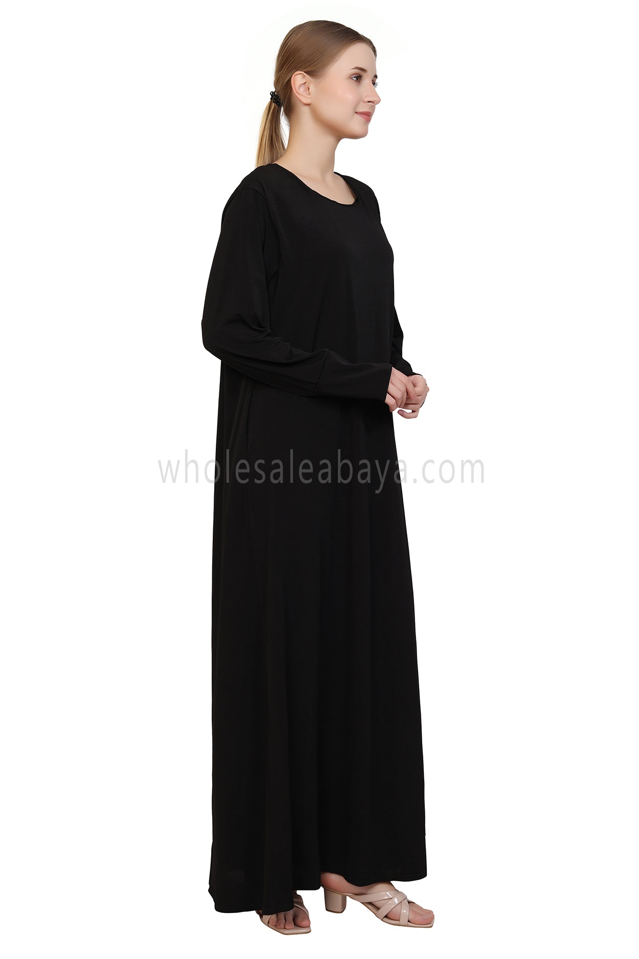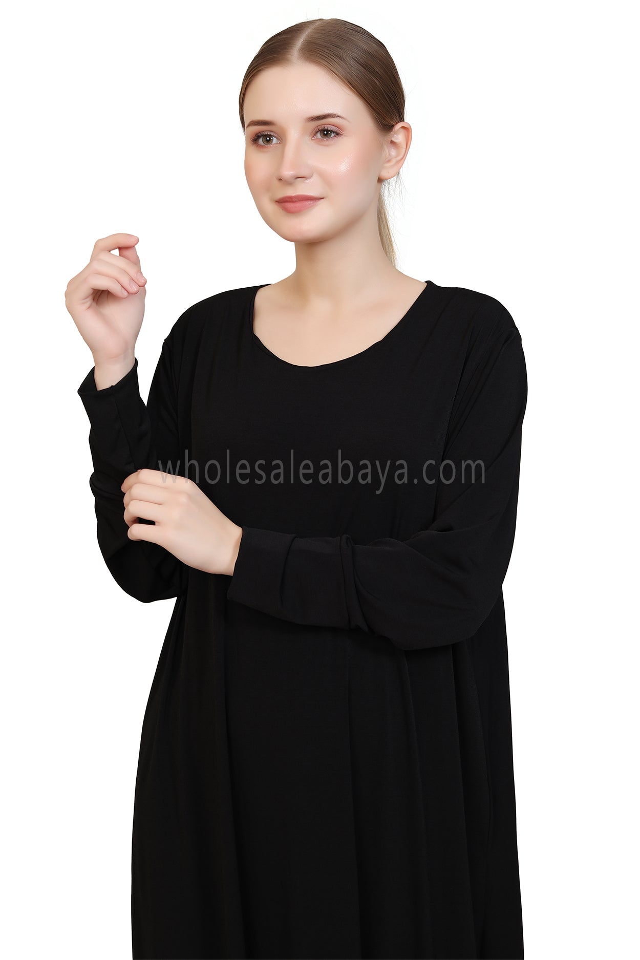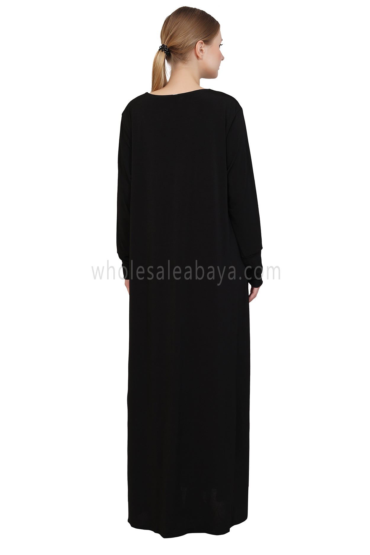 Made from soft, stretchable jersey fabric, this plain black abaya offers effortless comfort and versatility. Designed with side pockets for everyday convenience, it’s the perfect choice for both casual wear and layering. A timeless wardrobe essential that combines modesty with modern ease.