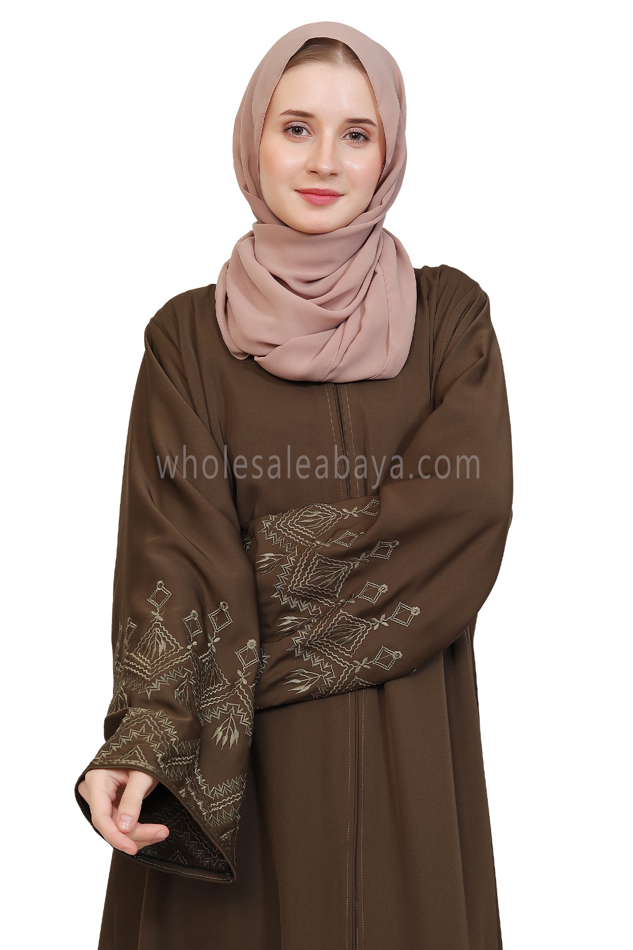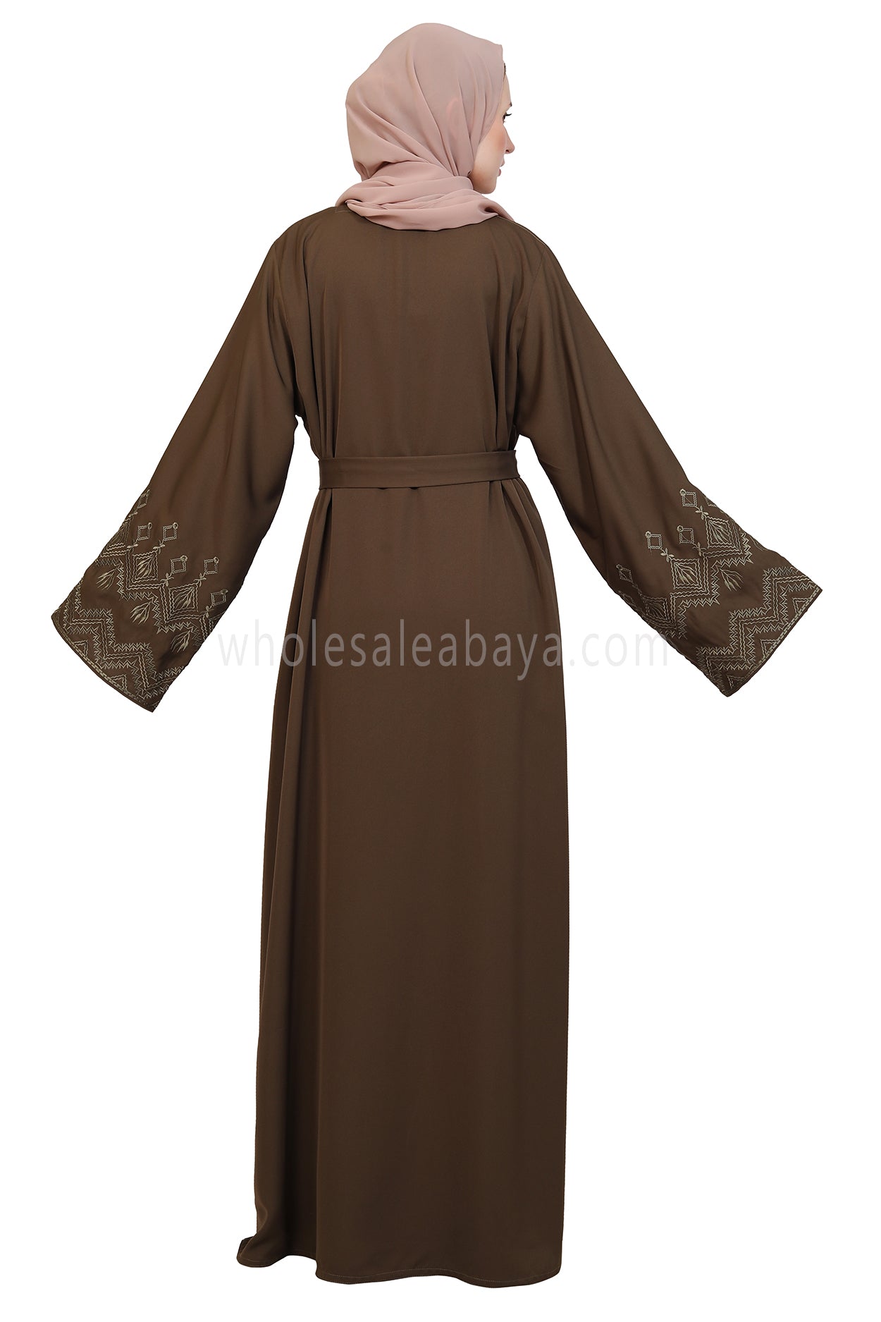 This Embroidered Open Abaya is crafted from premium Nida fabric, offering a soft, silky texture and ultimate comfort. The sleeves feature single-colour beige embroidery, adding a minimalist yet stylish touch to the elegant design. With a front button closure, optional matching belt, and practical sleeve buttons, this abaya combines sophistication with versatile wearability.