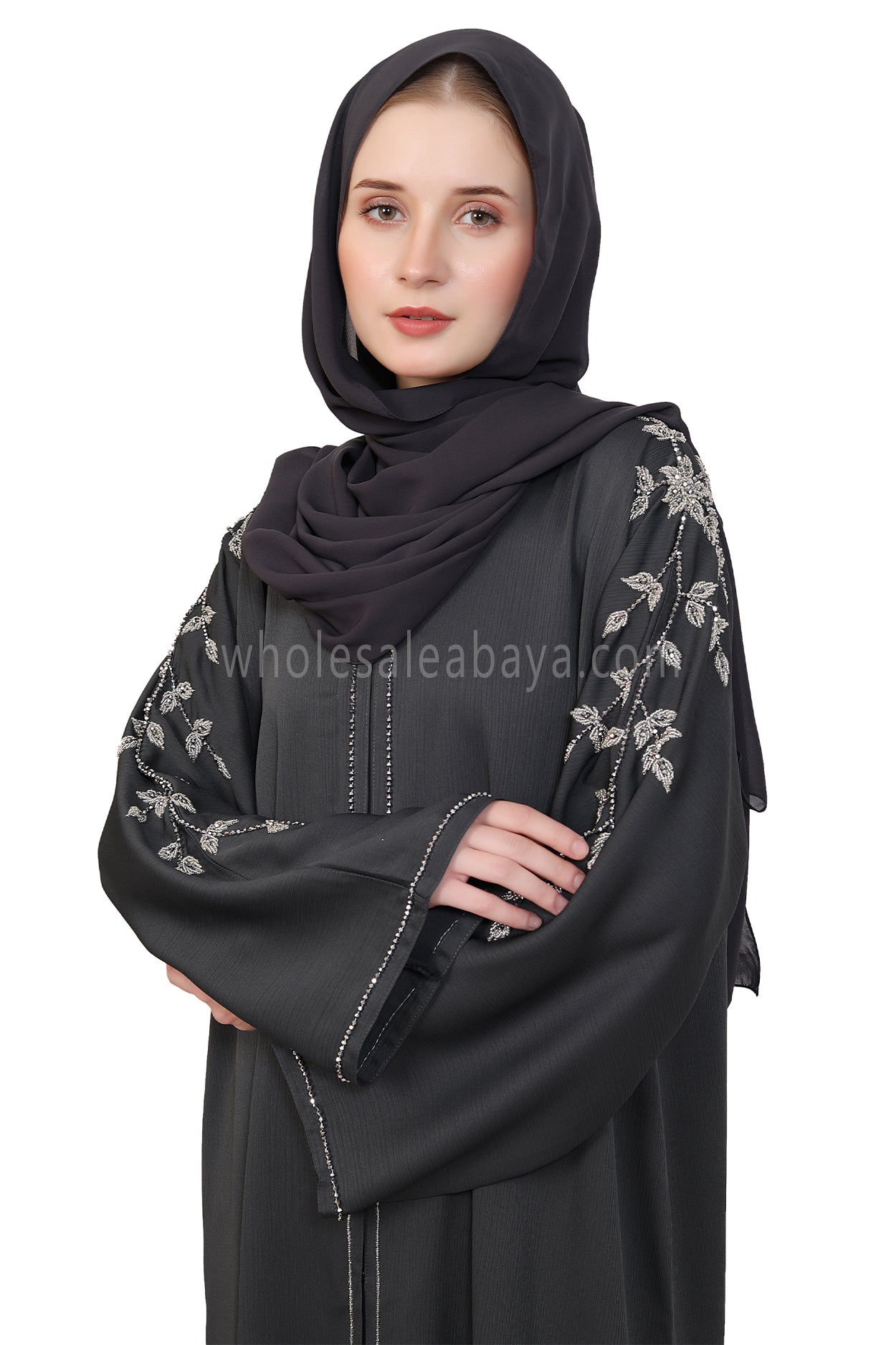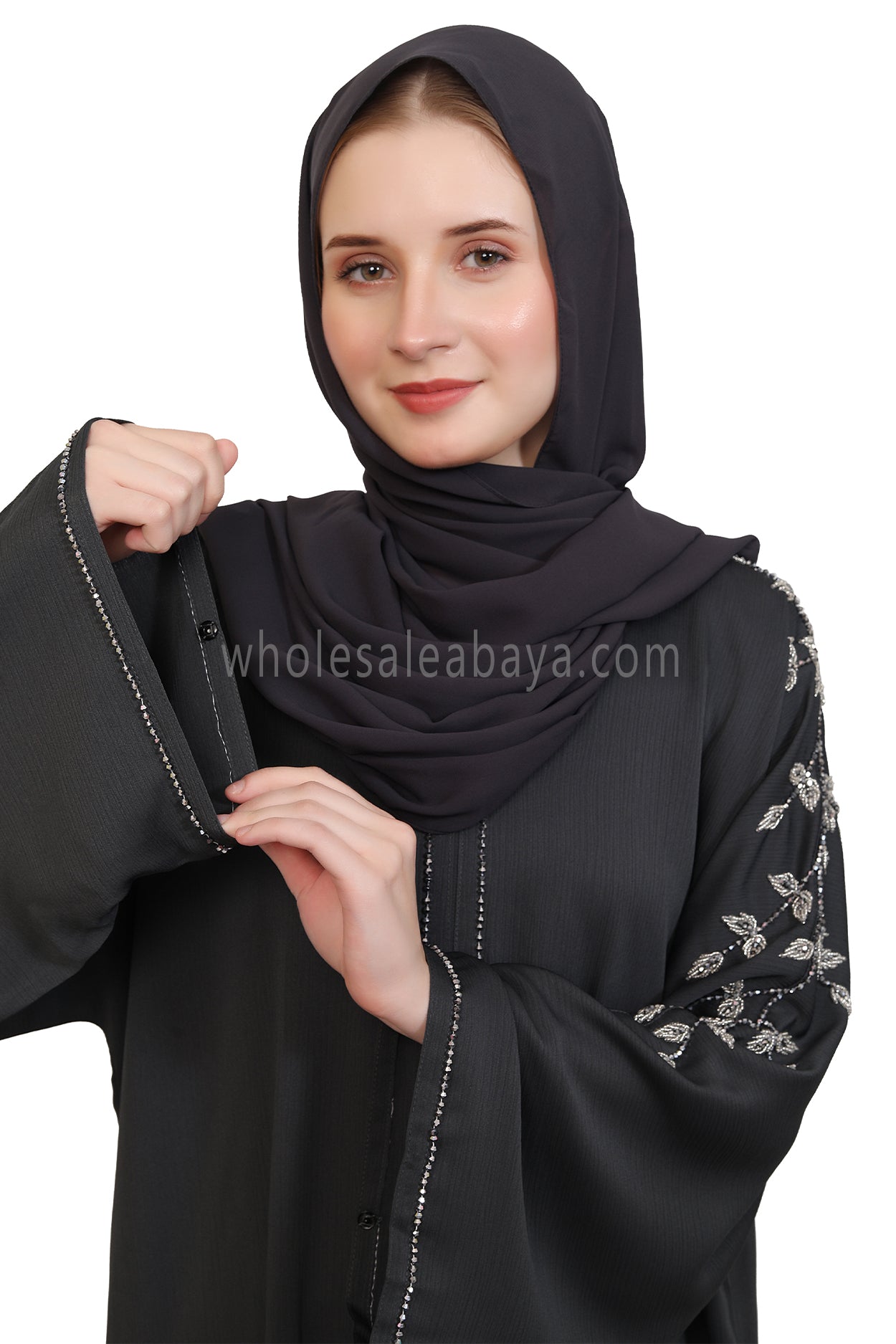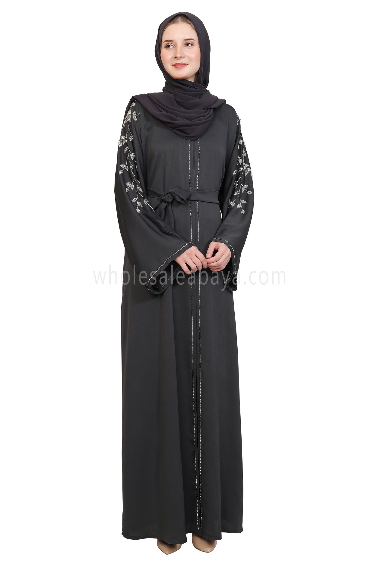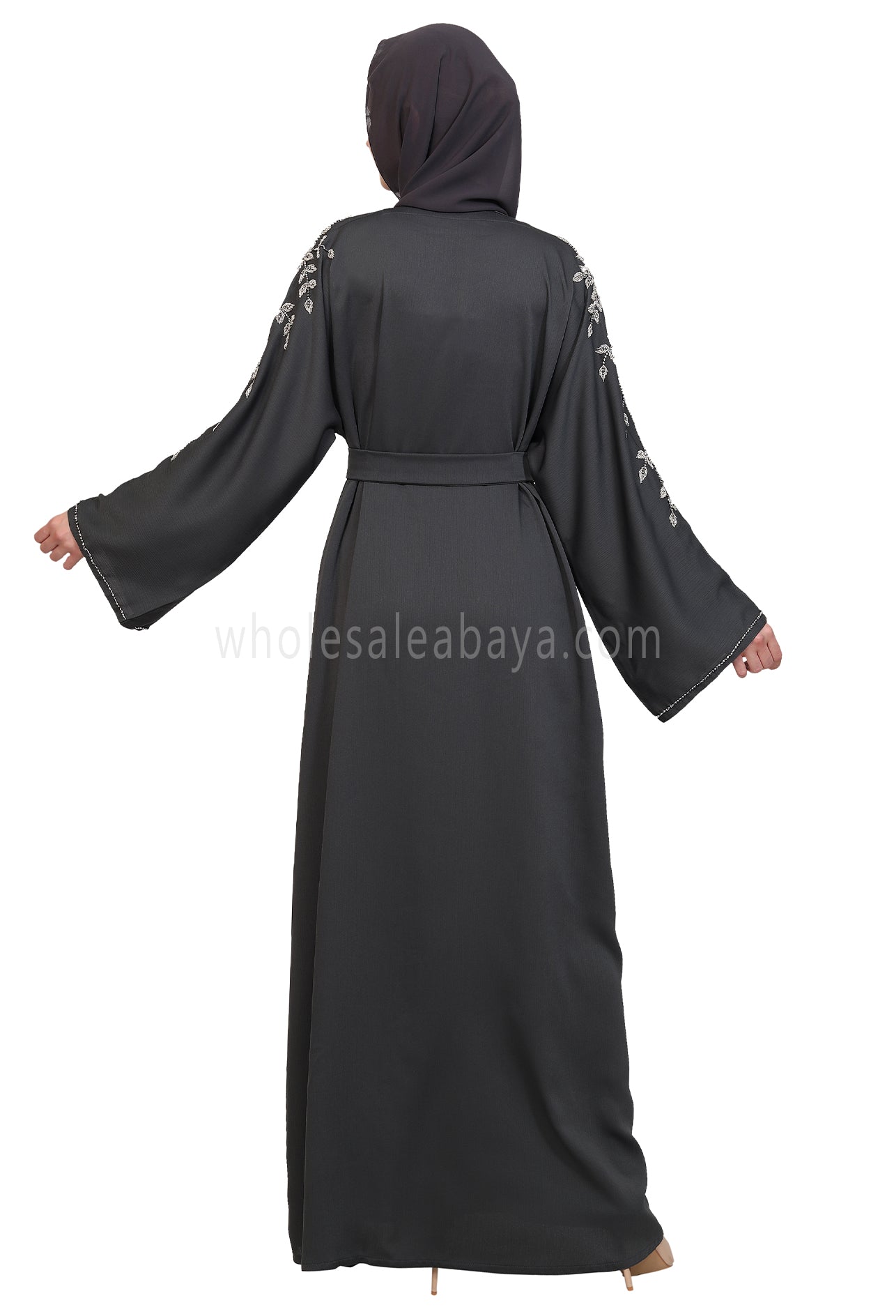 Crafted from luxurious Zoom Crinkle Crepe fabric, this elegant open-style abaya features intricate leaf handwork with silver and off-white glass stone beads extending from the neck to the shoulders. Additional beadwork lines trace the front and sleeve borders, adding a refined touch of sophistication. Complete with an optional matching belt and sleeve button detail, this design offers a premium structured look perfect for special occasions.