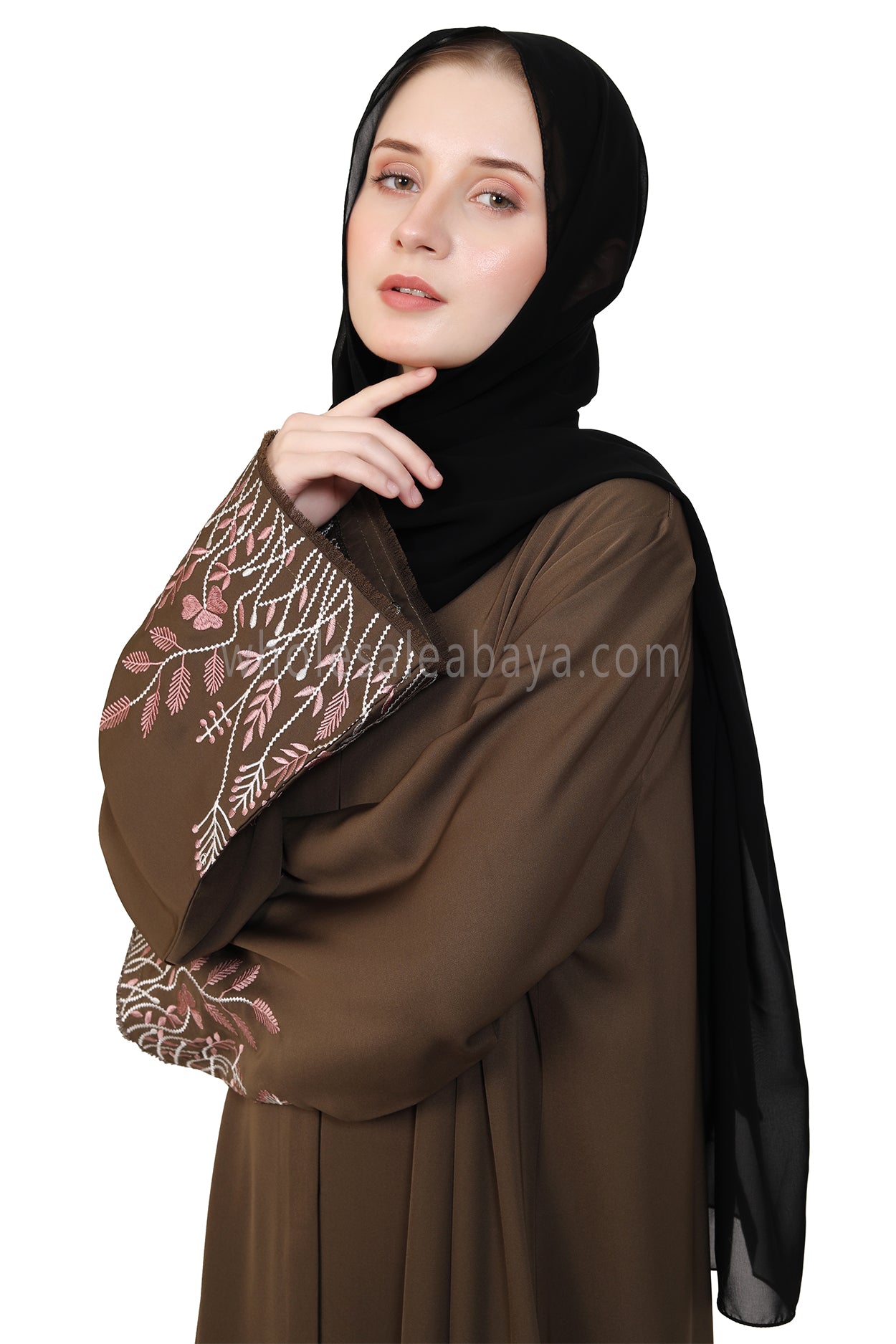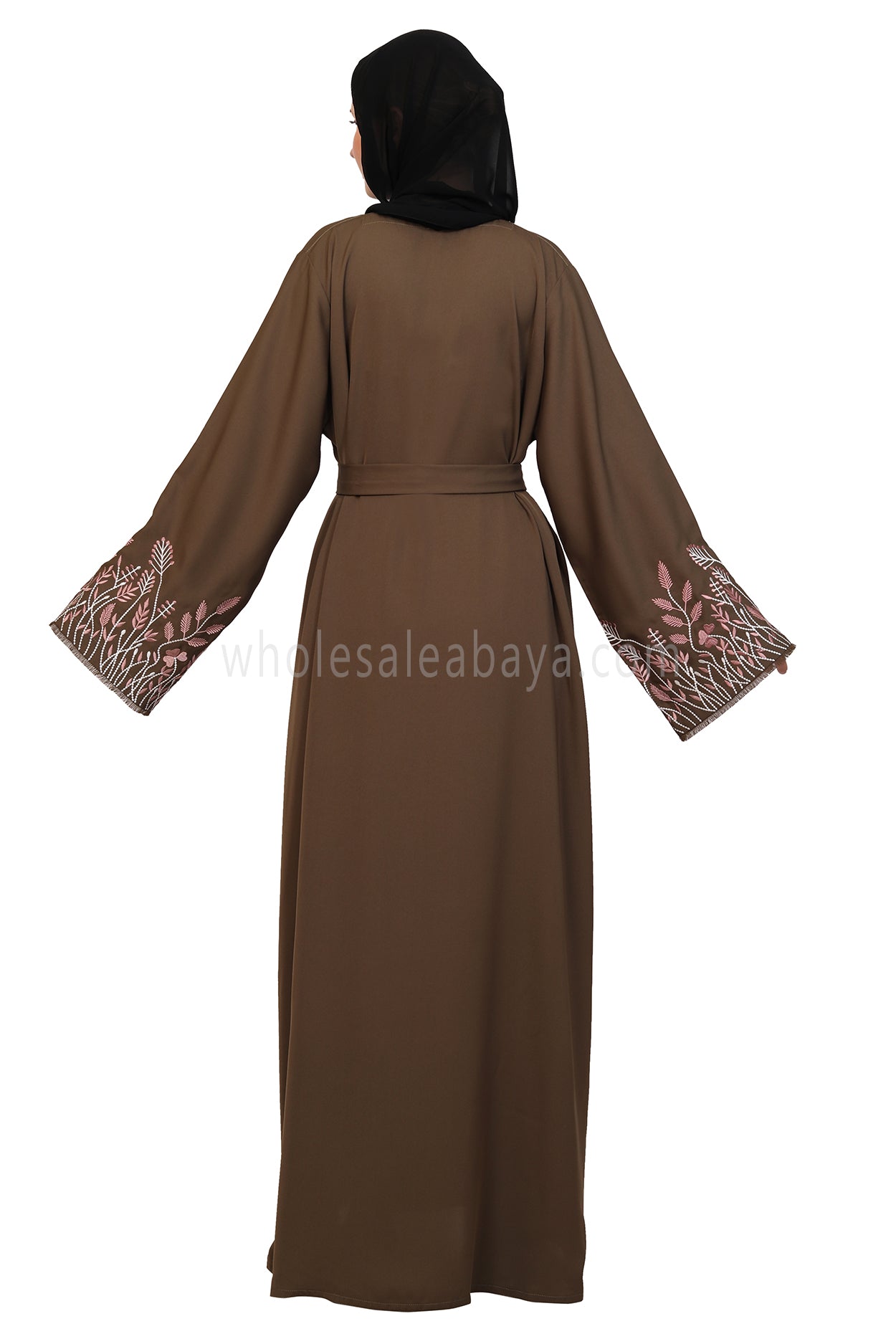 Made from premium Nida fabric, this elegant front-open abaya features delicate two-tone floral leaf embroidery in soft pink and beige for a refined feminine touch. The frilled sleeves add subtle character, blending minimalism with modern modest style. Finished with a matching optional belt and sleeve button detail, it offers comfort, elegance, and timeless appeal.