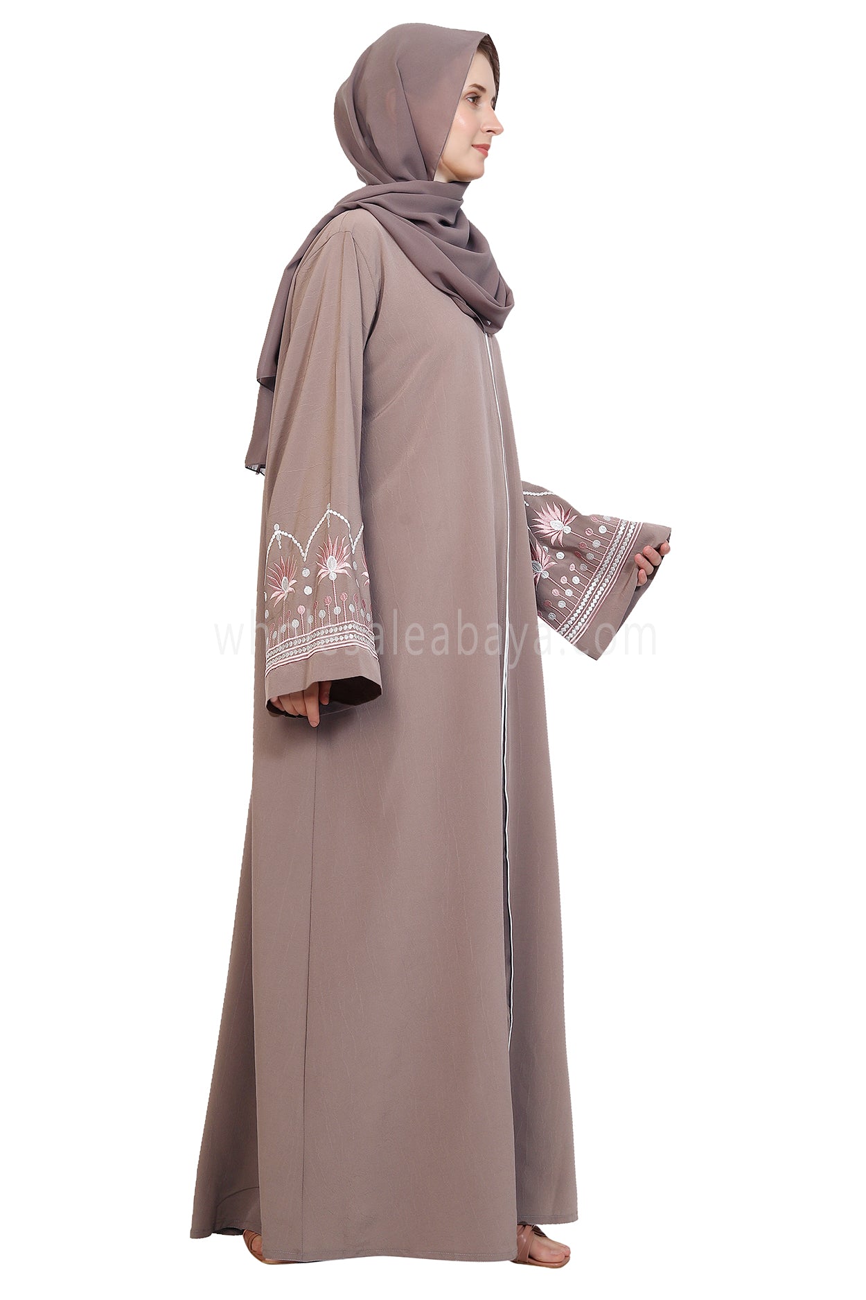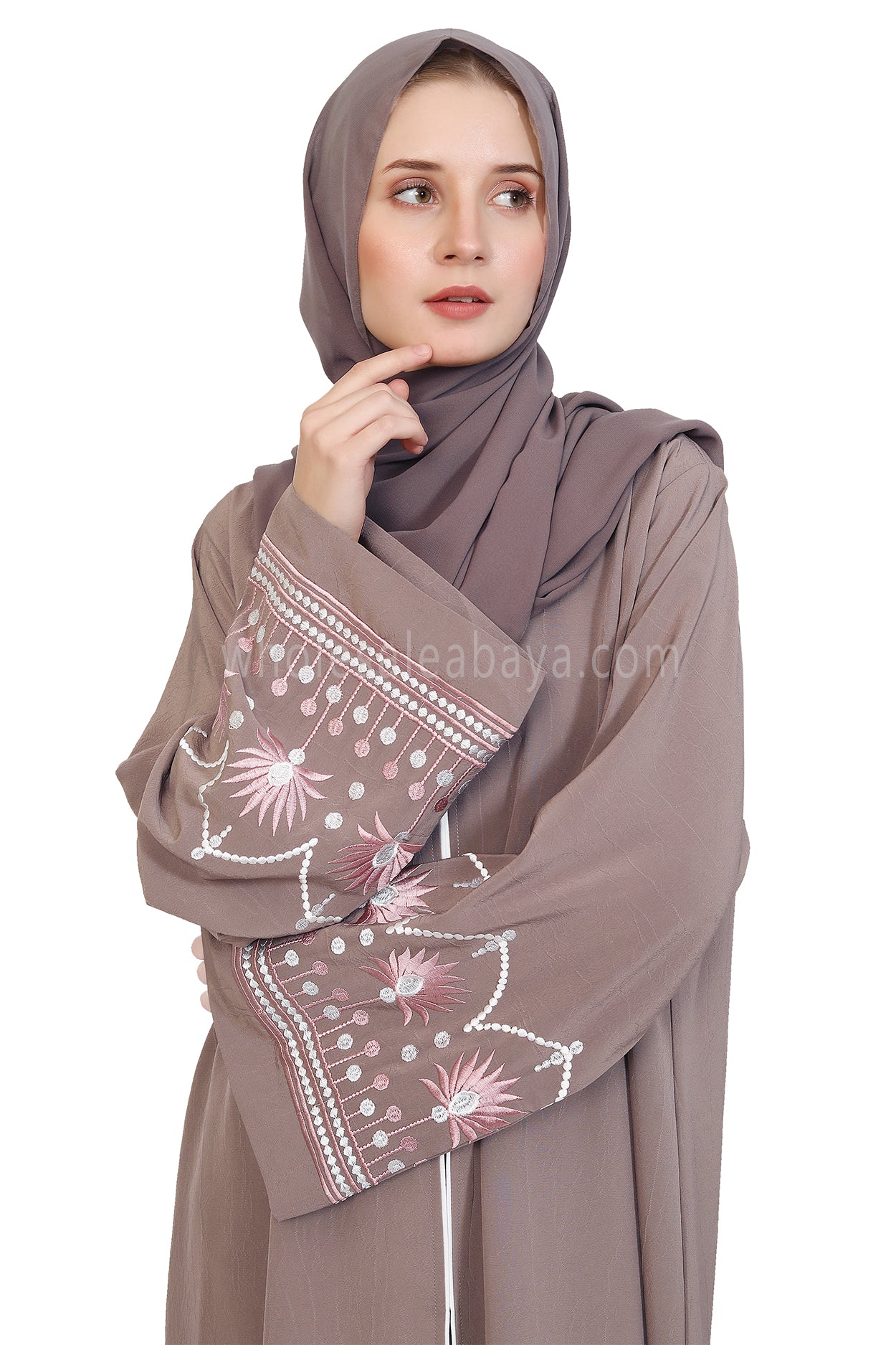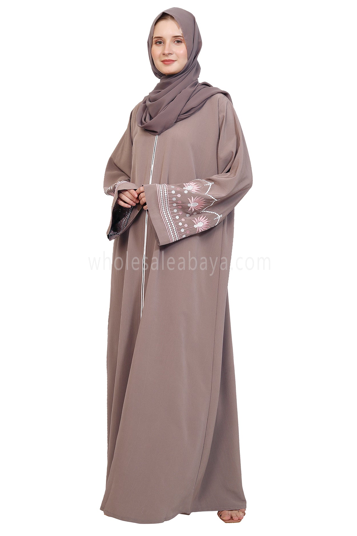 Enhanced Style with Embroidered Open Abaya crafted from Premium Arwa Crush Crepe fabric, offering a light weight, textured, and flowy silhouette. the sleevesfeature tri-colour floral leaf embroidery in cream,grey, and pink threads, creating a vibrant yet elegant design that adds character to the minimalist style. With front button closure, optional matching belt, and practical sleeve buttons, this abaya combines sophistication, comfort, and versatile styling options.
