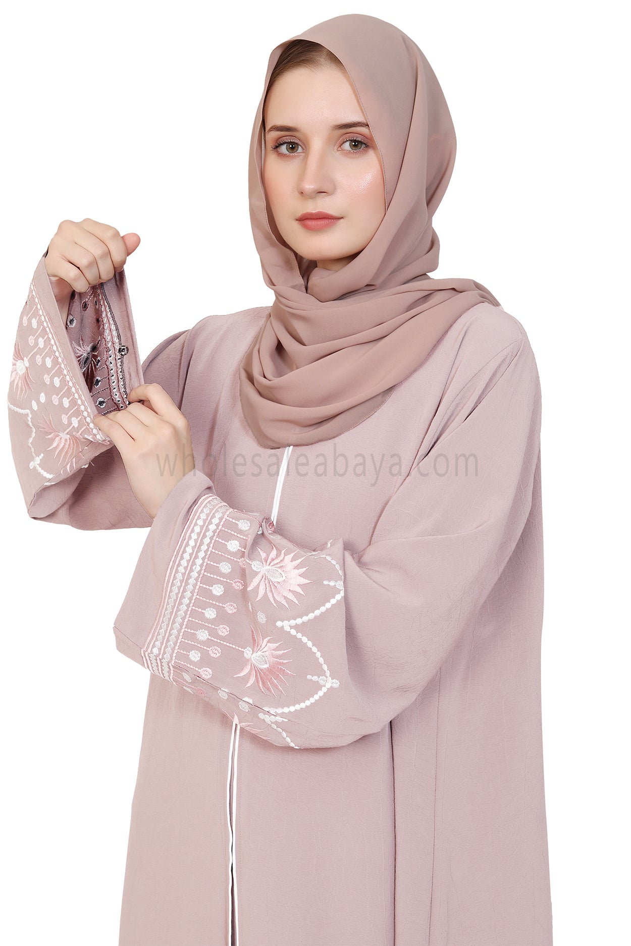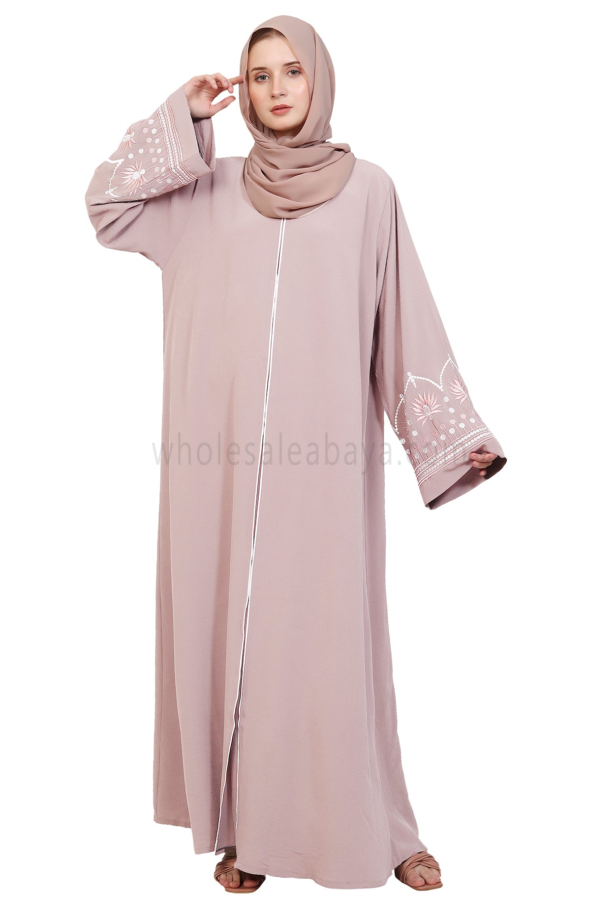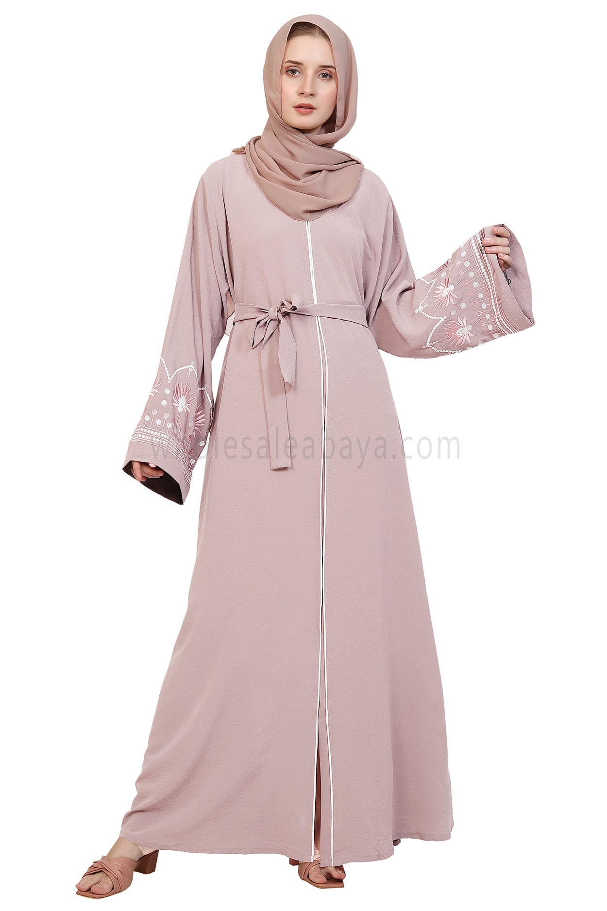 Enhanced Style with Embroidered Open Abaya crafted from Premium Arwa Crush Crepe fabric, offering a light weight, textured, and flowy silhouette. the sleeves feature tri-colour floral leaf embroidery in cream,grey, and pink threads, creating a vibrant yet elegant design that adds character to the minimalist style. With front button closure, optional matching belt, and practical sleeve buttons, this abaya combines sophistication, comfort, and versatile styling options.