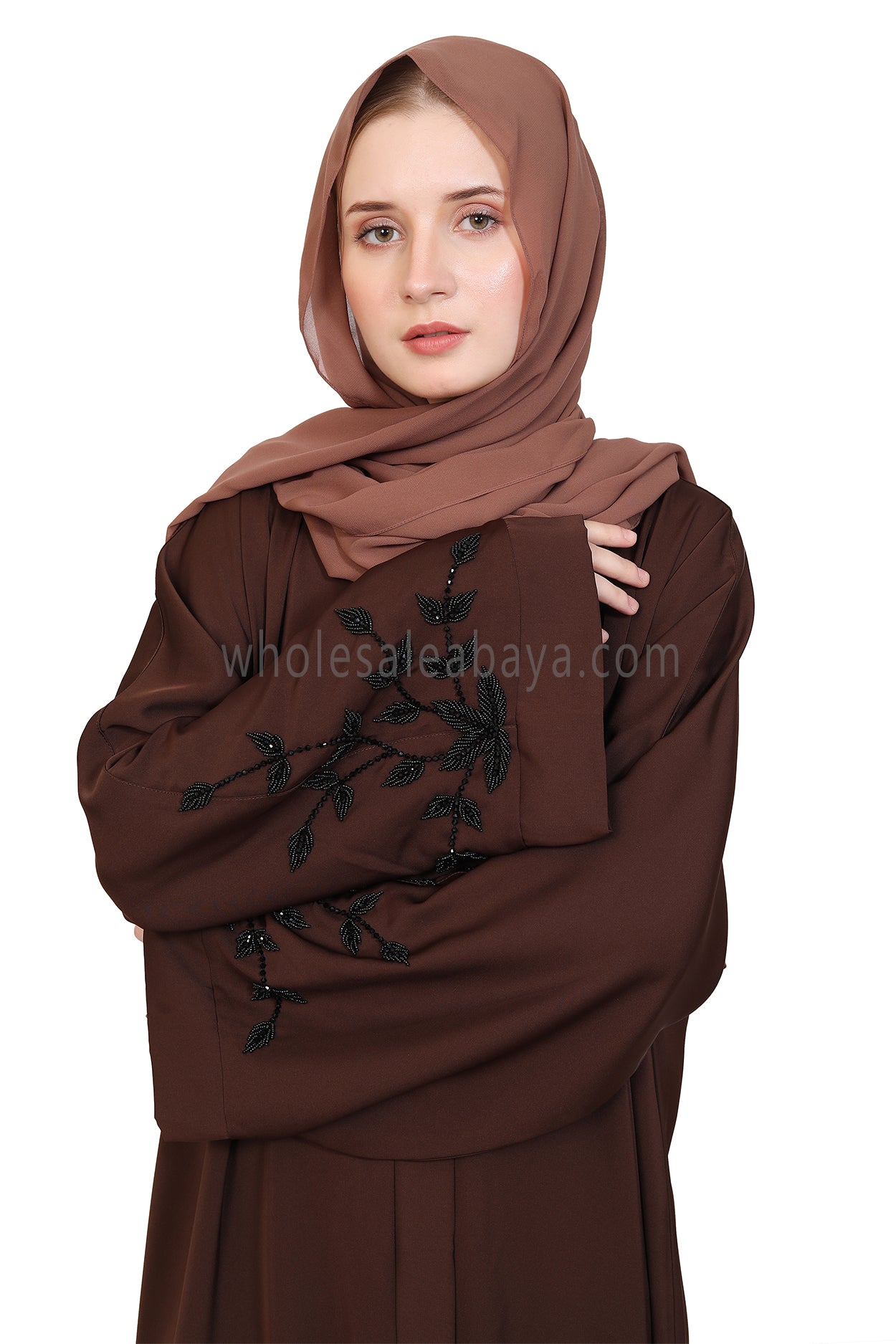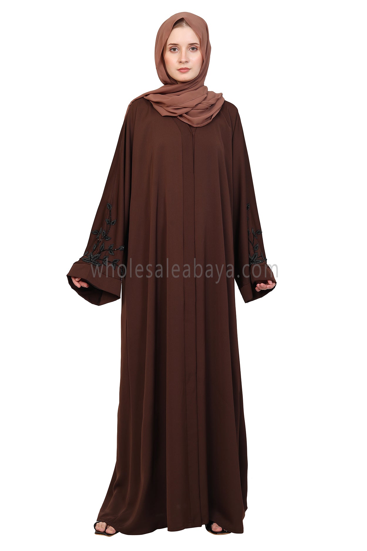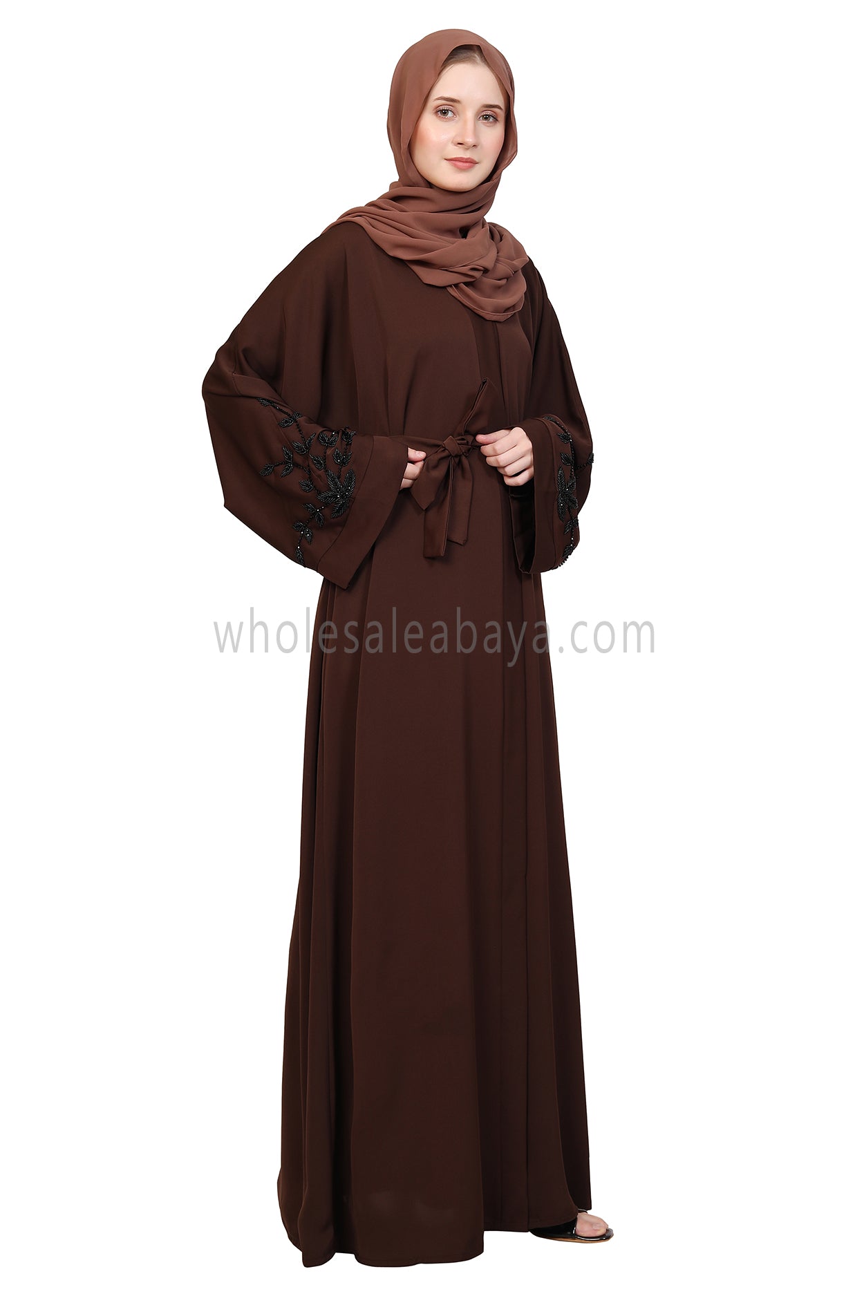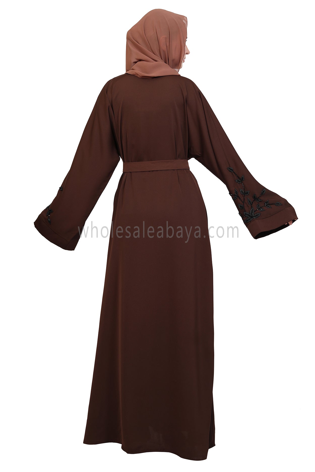Experience refined elegance with this Handwork Open Abaya crafted from premium Nida fabric, offering a polished and graceful silhouette. The sleeves feature exquisite black glass stone handwork in a delicate leaf motif, adding a sophisticated and luxurious touch. With a front button closure, optional matching belt, and functional sleeve buttons, this abaya combines timeless style with versatile wearability.