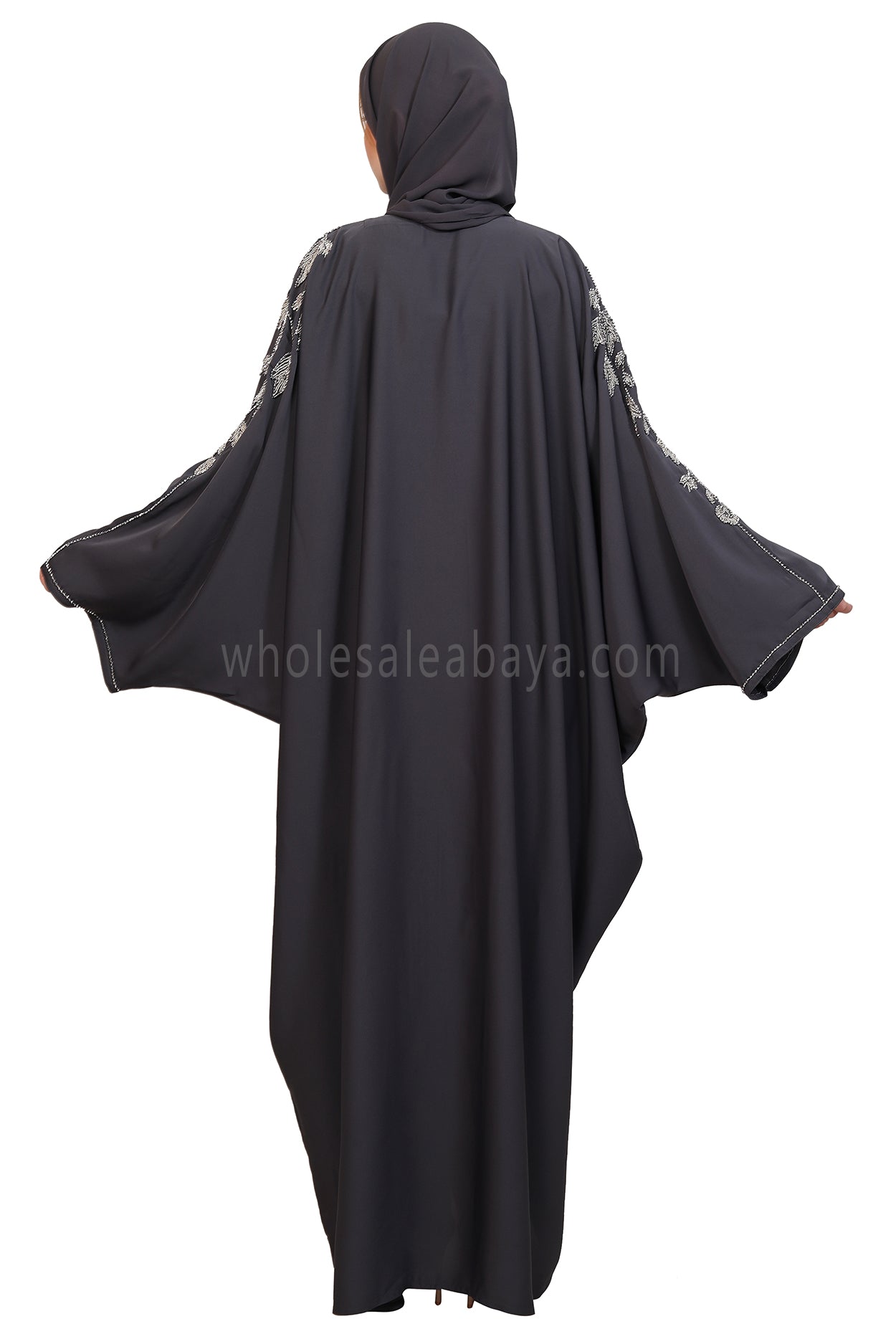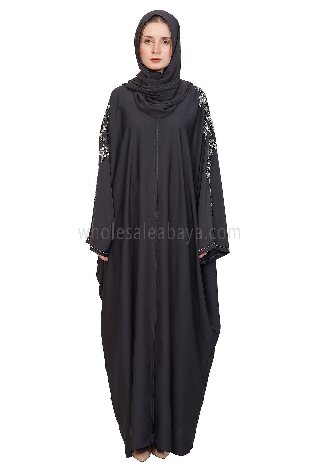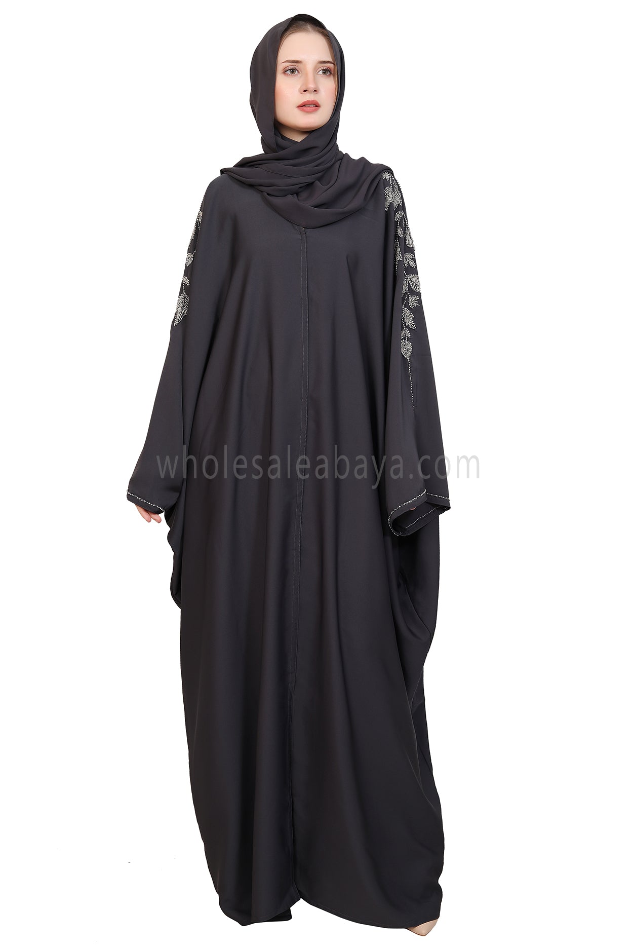This elegant handwork abaya is crafted from premium Nida fabric, offering a silky-soft texture and graceful flow. Designed in a butterfly open style, it features exquisite leaf handwork with silver and off-white glass stone beads that extend beautifully from the neck down to the shoulders. Meticulously handcrafted by skilled artisans, it blends timeless modesty with refined sophistication, perfect for special occasions or elevated everyday wear.