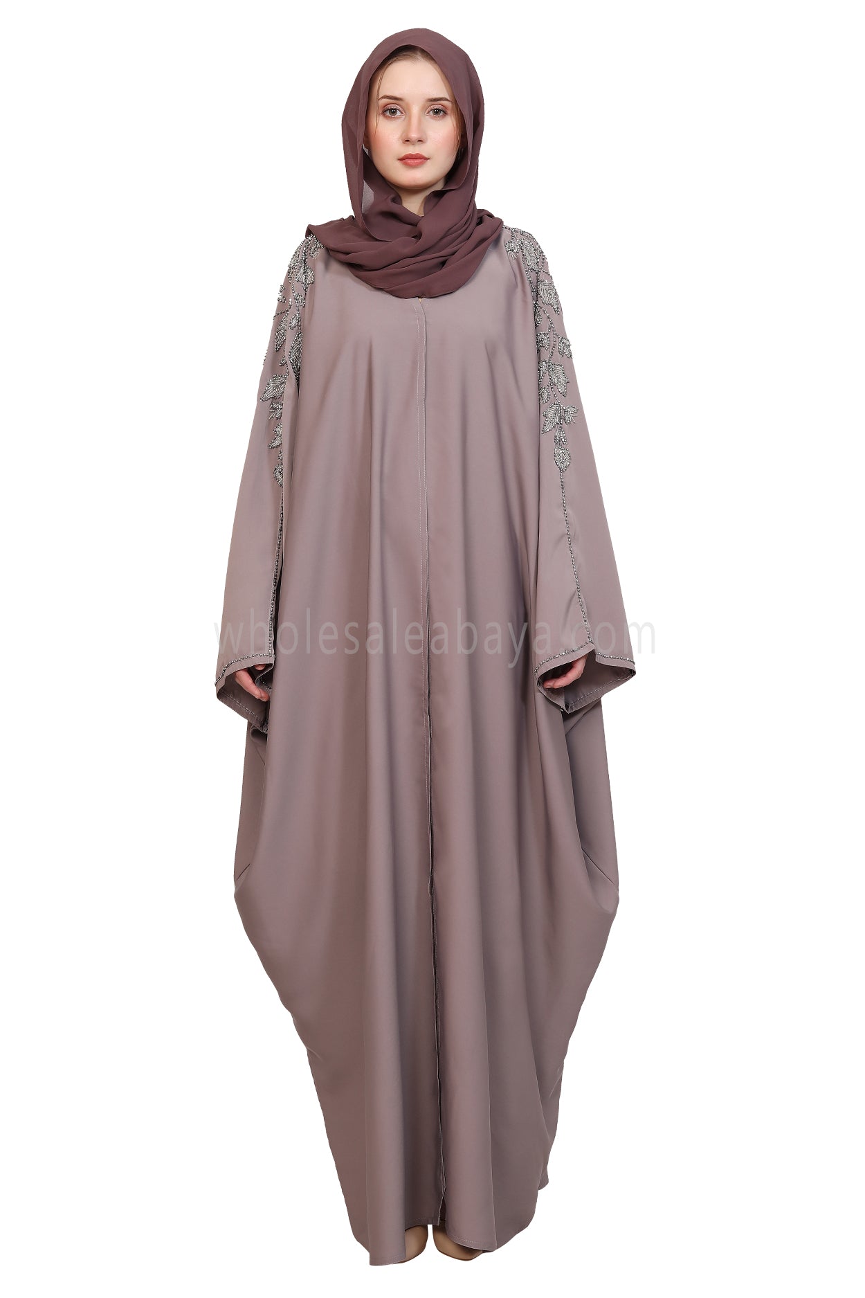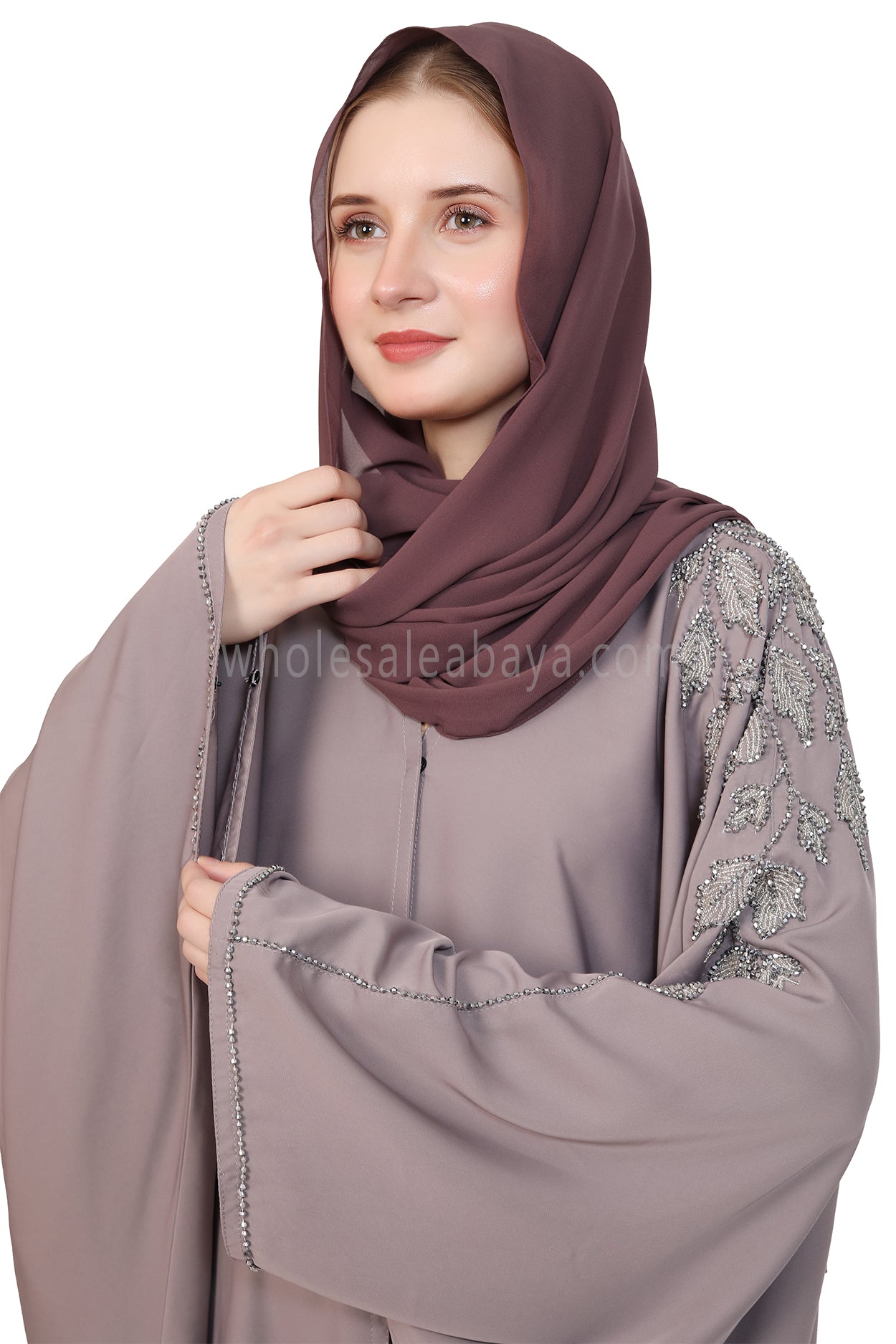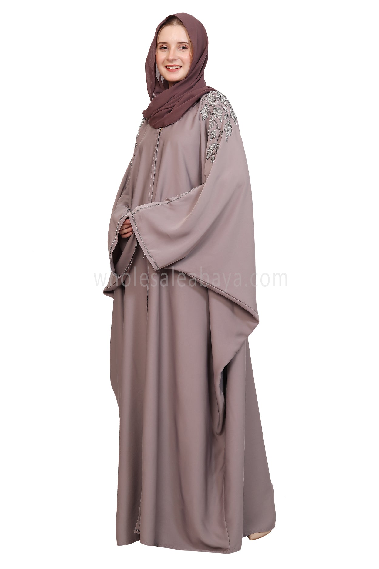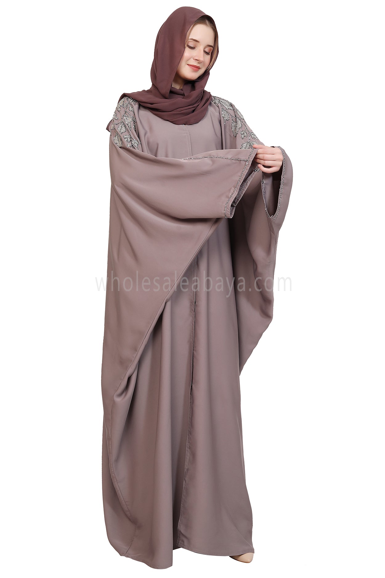 This elegant handwork abaya is crafted from premium Nida fabric, offering a silky-soft texture and graceful flow. Designed in a butterfly open style, it features exquisite leaf handwork with silver and off-white glass stone beads that extend beautifully from the neck down to the shoulders. Meticulously handcrafted by skilled artisans, it blends timeless modesty with refined sophistication, perfect for special occasions or elevated everyday wear.