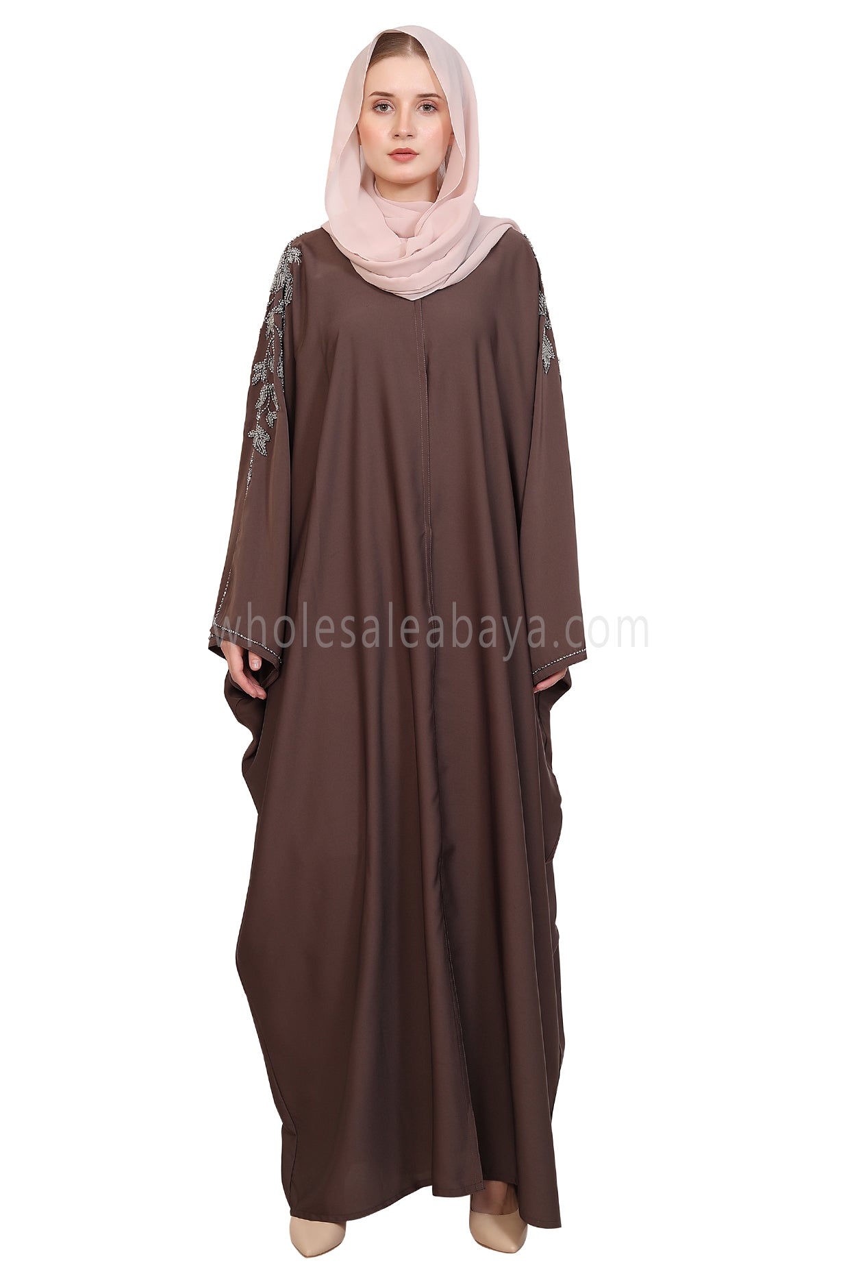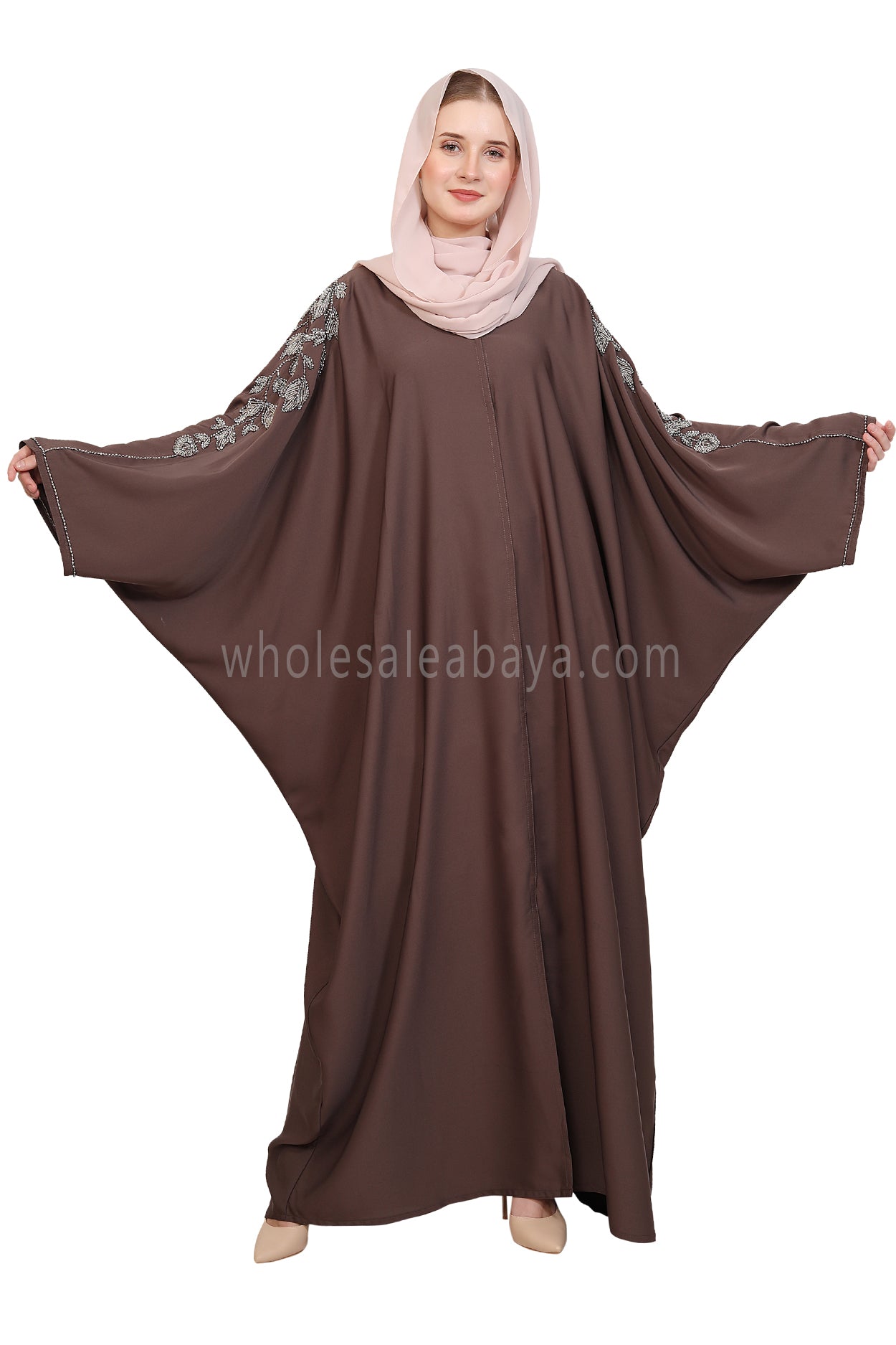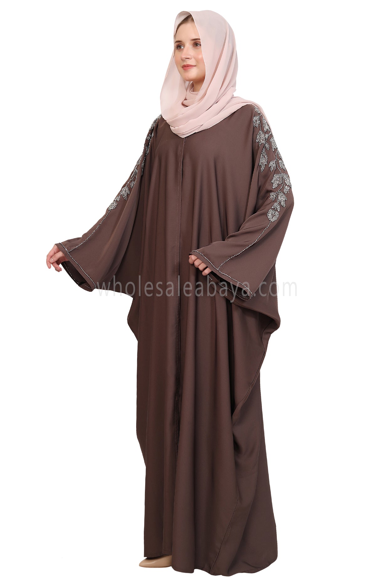 This elegant handwork abaya is crafted from premium Nida fabric, offering a silky-soft texture and graceful flow. Designed in a butterfly open style, it features exquisite leaf handwork with silver and off-white glass stone beads that extend beautifully from the neck down to the shoulders. Meticulously handcrafted by skilled artisans, it blends timeless modesty with refined sophistication, perfect for special occasions or elevated everyday wear.
