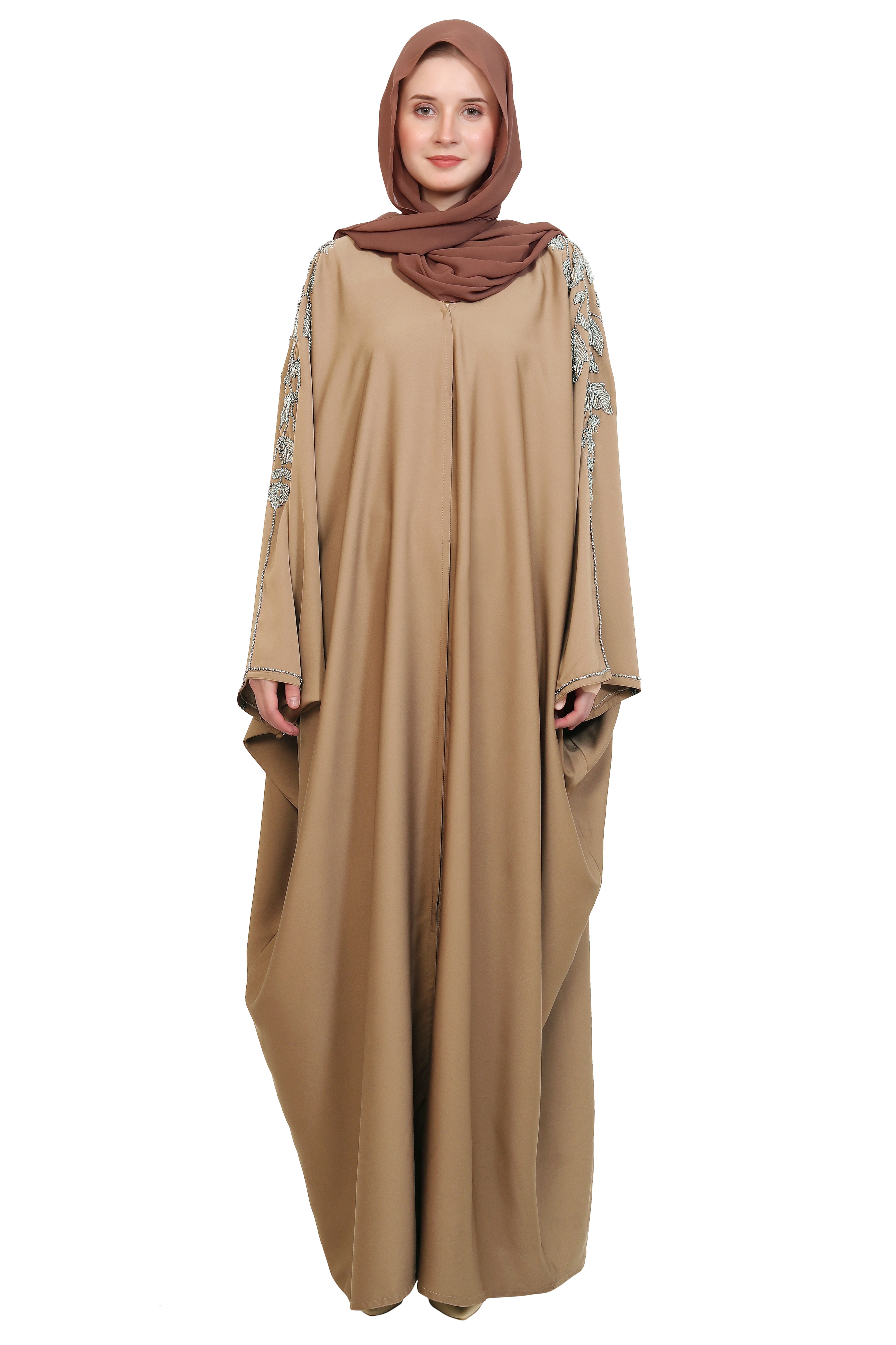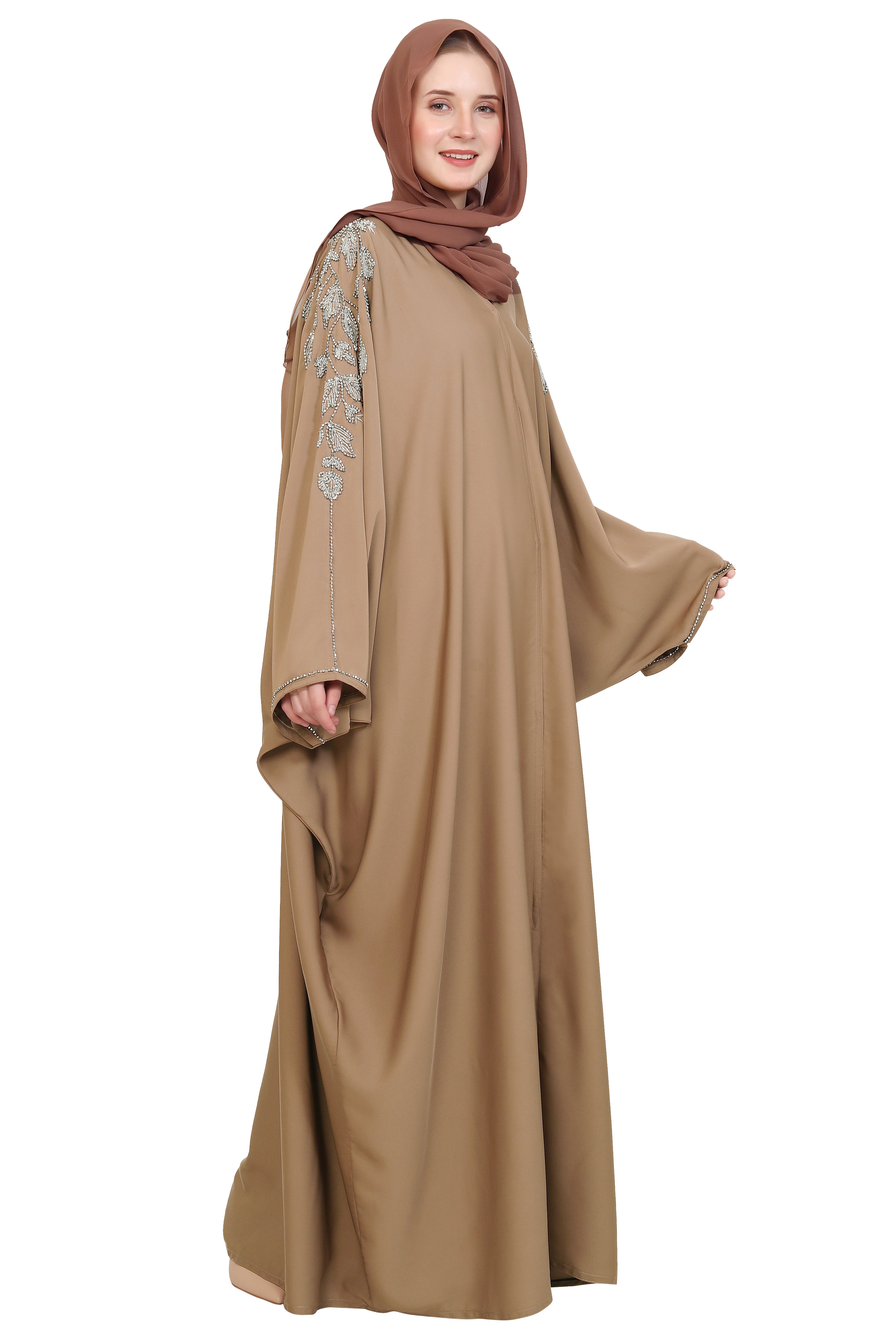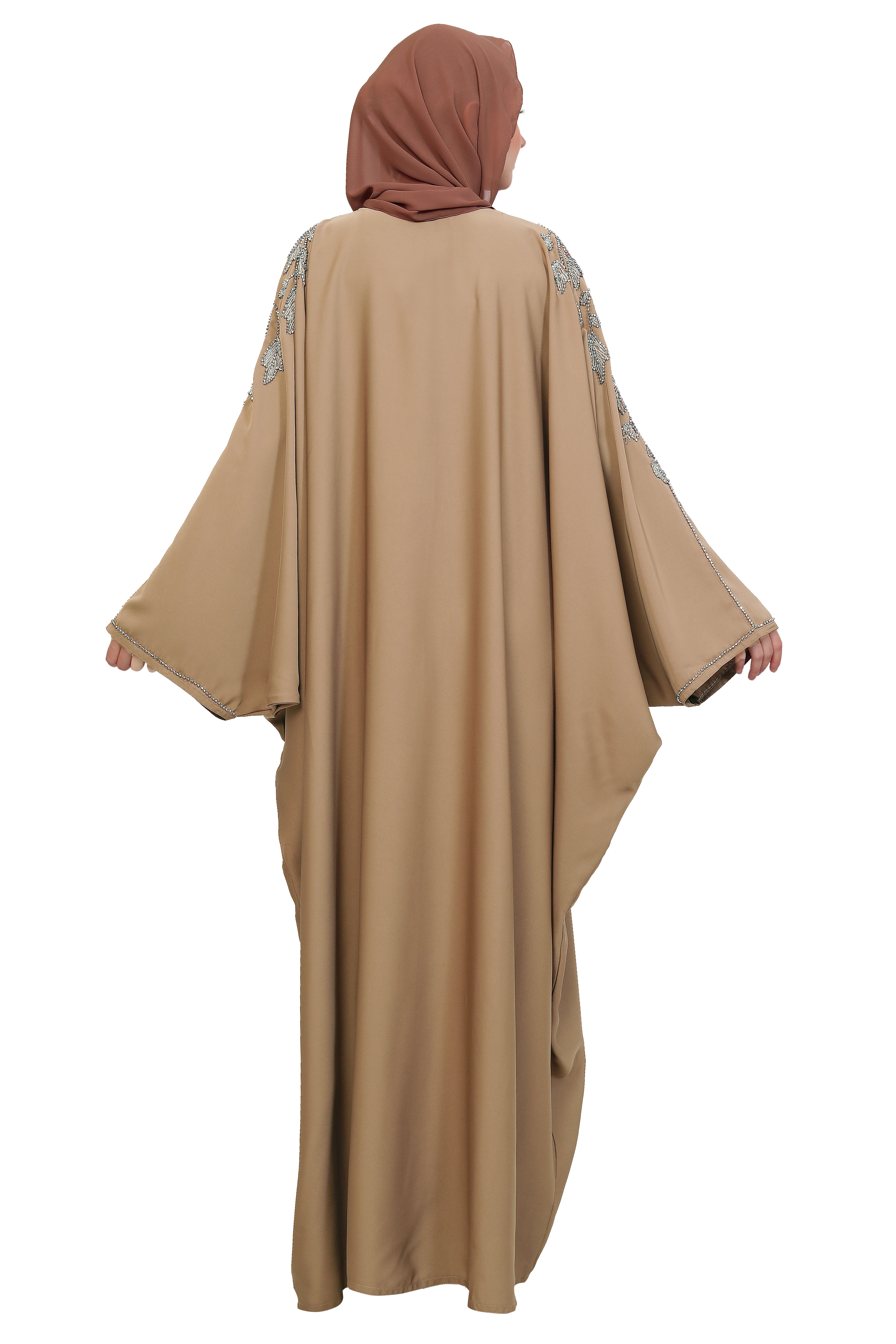This elegant handwork abaya is crafted from premium Nida fabric, offering a silky-soft texture and graceful flow. Designed in a butterfly open style, it features exquisite leaf handwork with silver and off-white glass stone beads that extend beautifully from the neck down to the shoulders. Meticulously handcrafted by skilled artisans, it blends timeless modesty with refined sophistication, perfect for special occasions or elevated everyday wear.